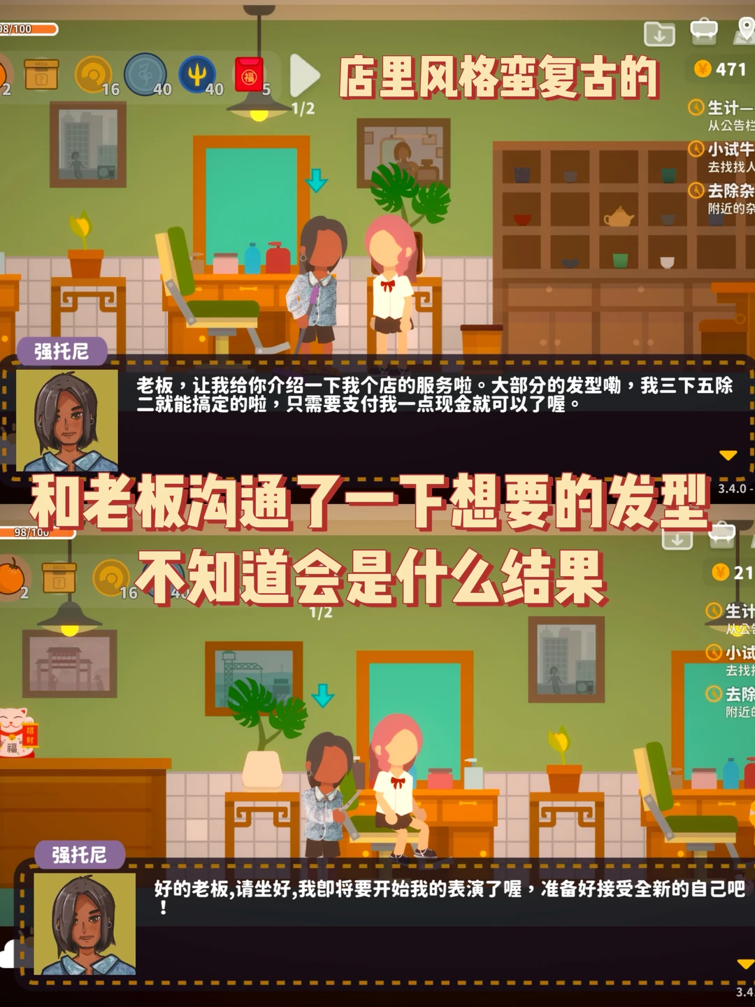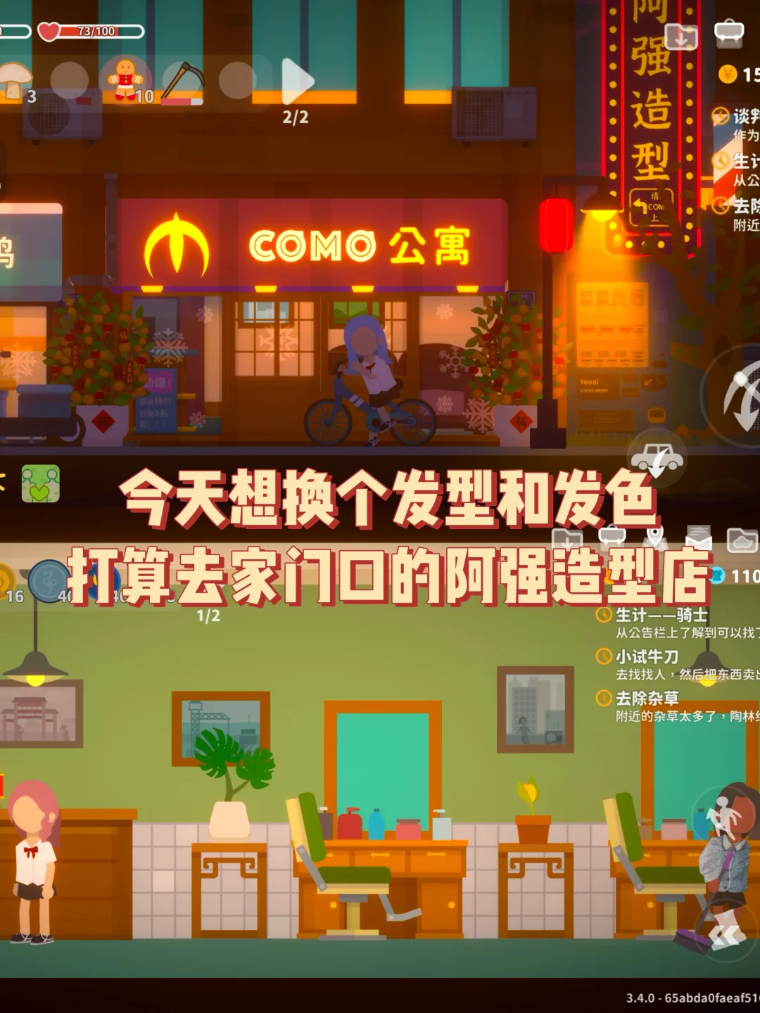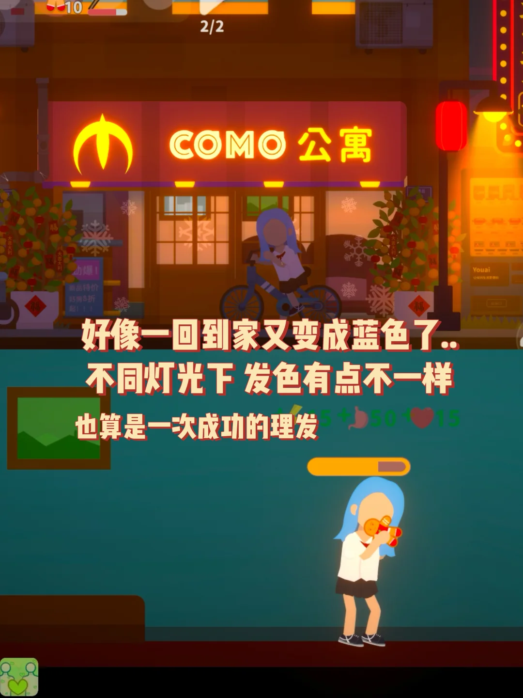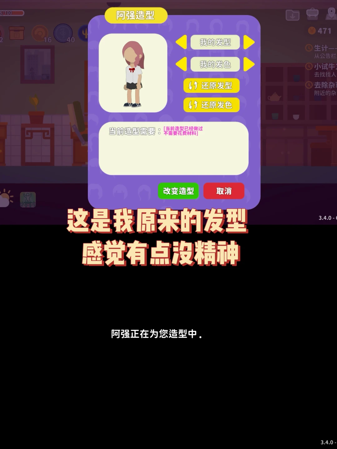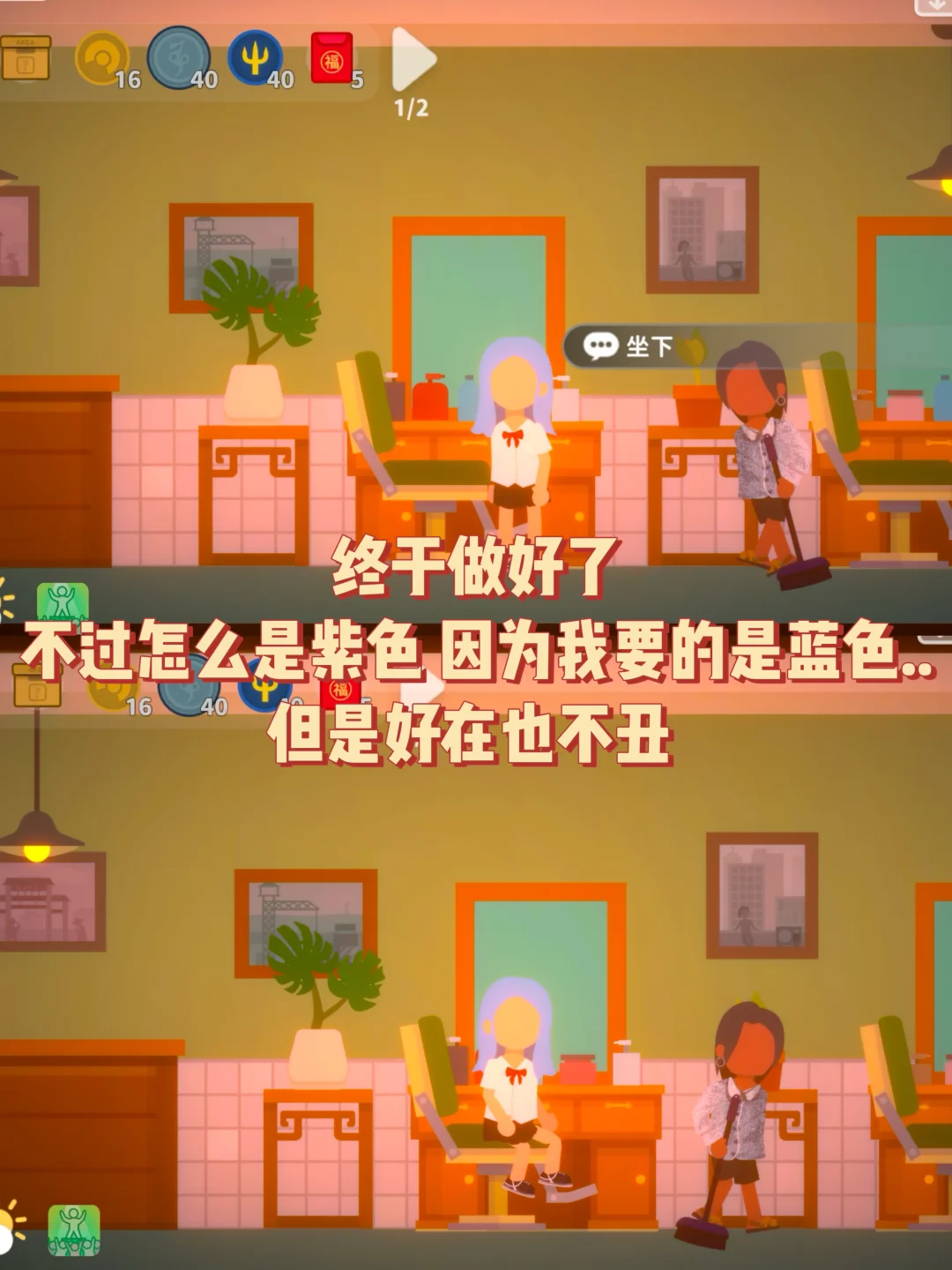 今天想换个发型💇♀️ 去公寓楼上的阿强造型做了个头发 我选了中长发和蓝色发色 等待阿强做好... 做完的结果还比较满意👍虽然发色有点不对 但也很漂亮😻 这游戏自由度真的很高!!!再出个联机模式就完美😍