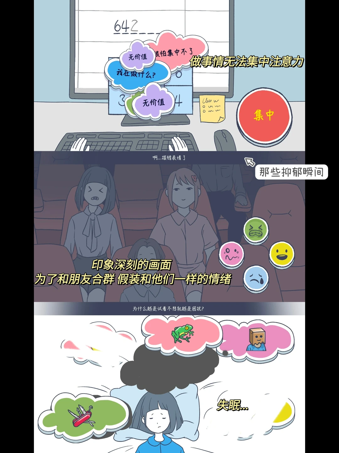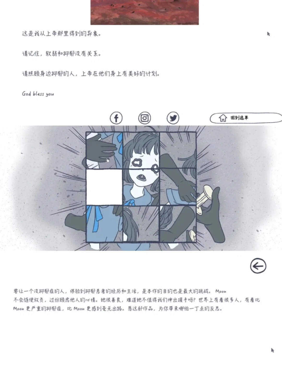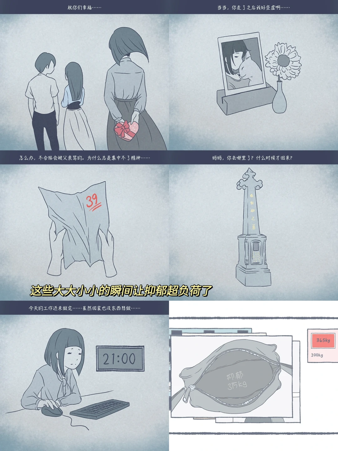 🎮:抑郁的房间/Room of Depression 🎮:Steam & Android ✅ 🎮:剧情|互动|治愈|休闲|独立 - 你身边有抑郁症患者吗? 在本游戏里,我们可以进入抑郁者的世界,去感受抑郁。 游戏总共20章,每一章都很短,在每章结束后,会出现只有一个出口的有着光的隧道。在你走向出口时,一路上会有照片,有文字。每次的文字都不一样,暗示的结局也不同,可能是制作组也在引导我们思考。 - 🔥篇幅短,体量小,快速通关 🔥温暖治愈的手绘画风➕舒缓音乐 🔥游戏立意很好,关注抑郁患者 🔥互动情节很丰富和独特,如汉堡食材选择、做蛋糕等 🌟最让人印象深刻的是电梯超载的片段,制作组太有创意了,超载的不是体重,而是抑郁的情绪。 🌟还有一个片段是每天看着如此快乐、无忧无虑的朋友,结果却因抑郁而紫砂了,这也时刻提醒我们真正的抑郁患者可能是看不出来的,但其实他们的情况也许已经很严重了,所以要多关心身边的人。 💌制作组真的很有心,玩完也真的会引发很多思考,超级良心的好游戏值得被更多的人看见! 🪞到底是治愈游戏还是致郁游戏,玩完你就知道了
