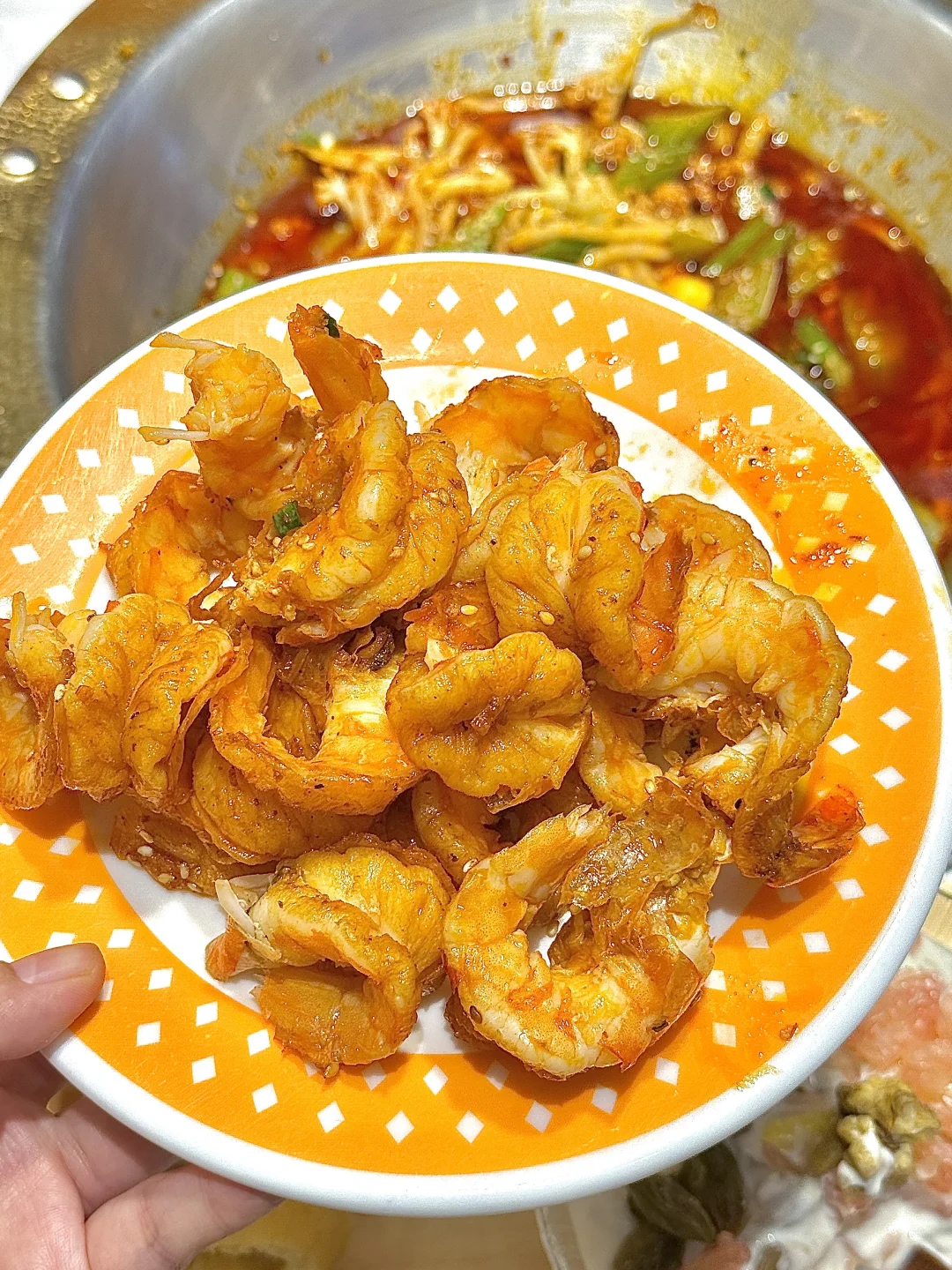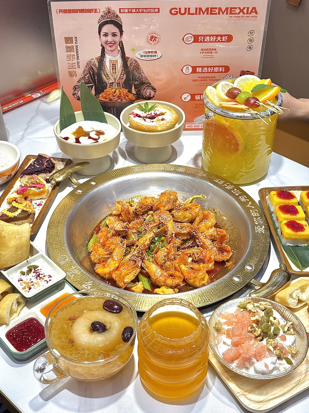 特色虾必点,每只虾都开背去虾线,外壳酥脆内里 Q 弹,肉质紧实,香辣过瘾!再搭配店内特色新疆美食和饮品,酸奶粽子、果酱包尔萨克、水果超级桶、固体杨枝甘露……不仅每个都是解辣神器~而且颜值口感双在线,妥妥的 “漂亮饭”,实物和图片一样诱人,巨出片📸
