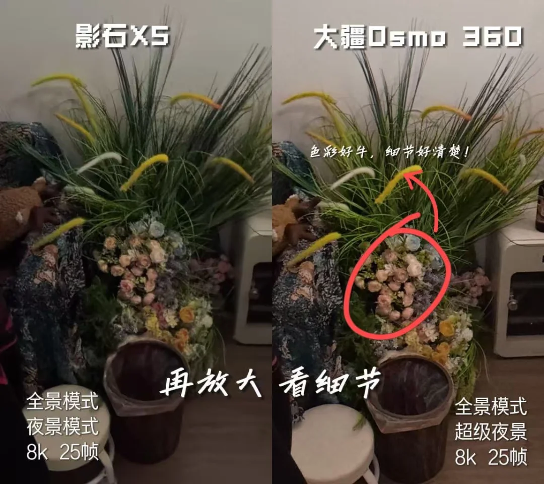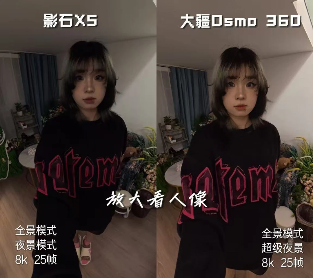 仍然是—— 📷大疆osmo360 / 📷影石360 X5 - 传感器:这次是夜景拍摄,传感器的差距,真的又一次体现出来了,在暗环境下,大将依旧能够体现出更多画面细节 - 色彩:大疆是10bit,影石是8bit,这点在拍景色、灯光时,会尤其明显。 - 画质:这次出门也是对同一个画面进行了多次裁切、放大,很多时候大家使用全景相机,后期编辑的时候都是会对画面进行处理的,所以画面细节其实还是蛮重要的,多次放大之后,大疆在细节这个方面……真的很绝