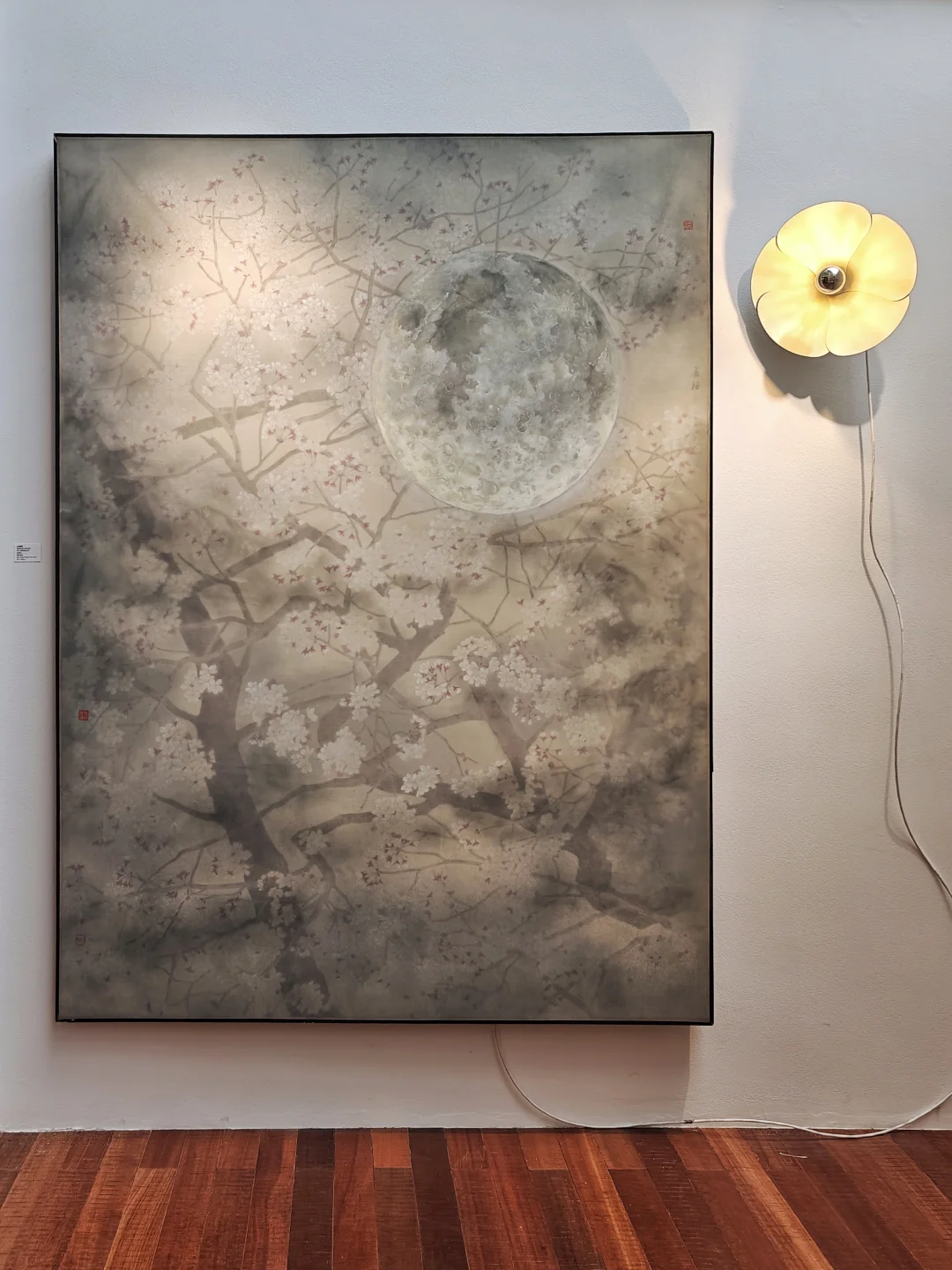 ⚫《上林春裳》:双绢叠映(两层薄绢叠加)形成月光漫漶效果,夜樱与月影在虚实间定格,隐喻东方美学中的“温柔距离”。