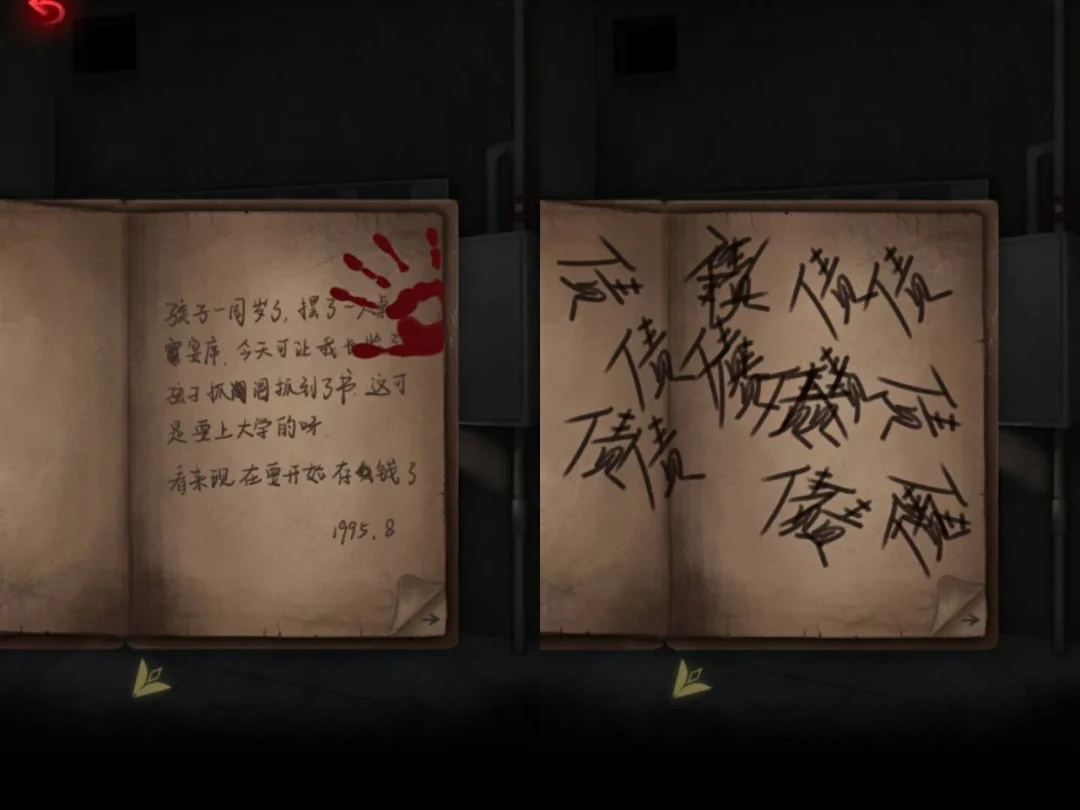 ▪️后续进了厕所 发现周遭都变化了: 缠绕的女人的头发、满是血滴的洗手池、带血印的日记本、蹲坐在门口的童男童女等等