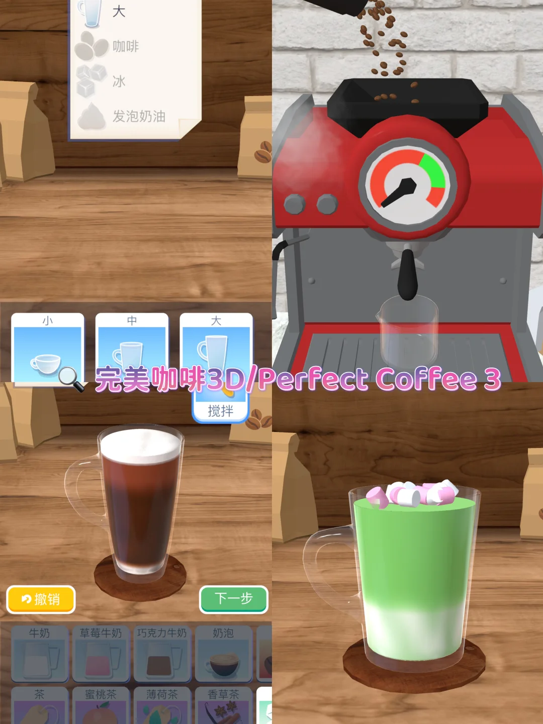 做咖啡饮品,画风比较真实。操作是3D的,背景音乐让你沉浸式做咖啡,一定要打开!