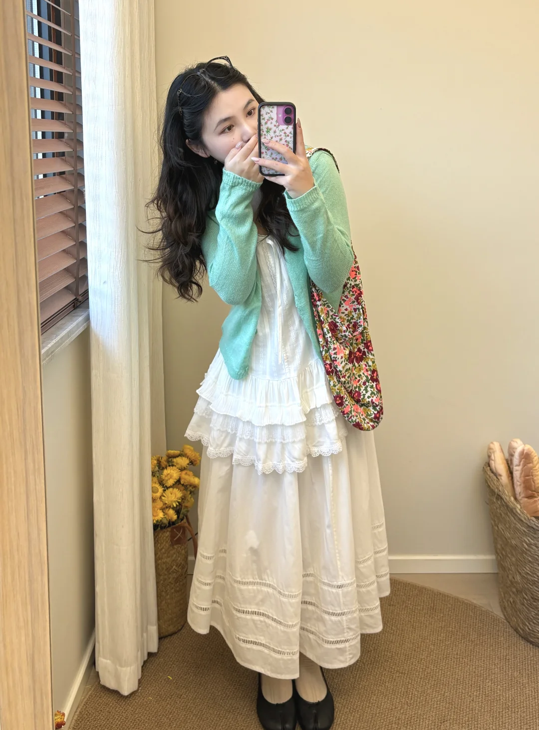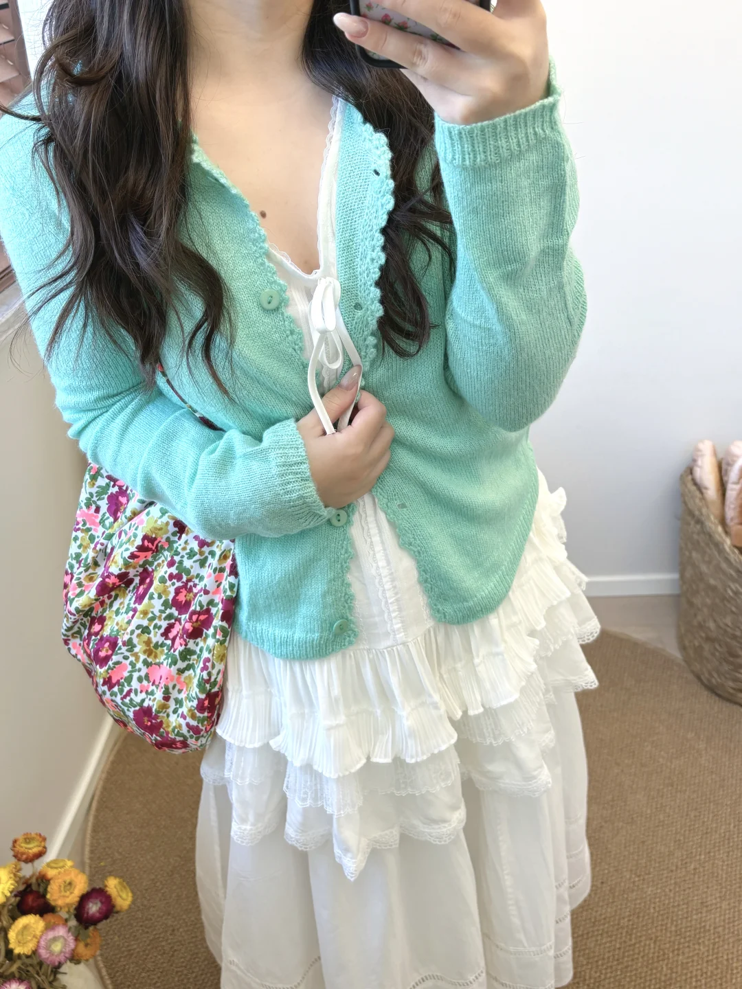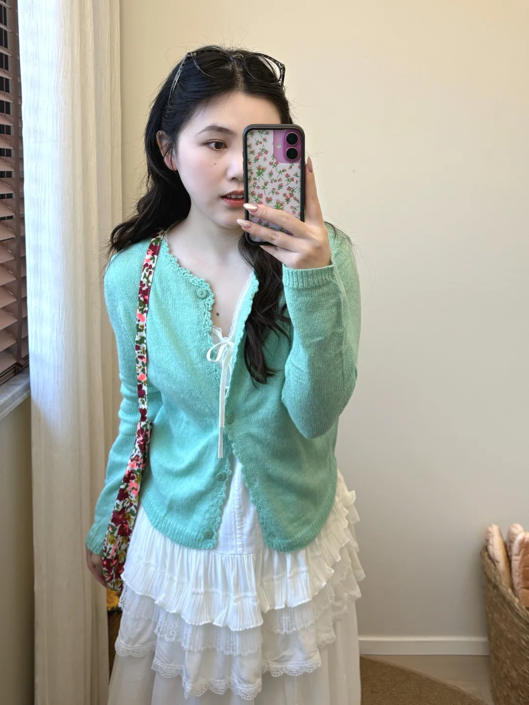 这个开衫颜色太靓啦~ 里面的下摆花边很适合春夏叠穿!