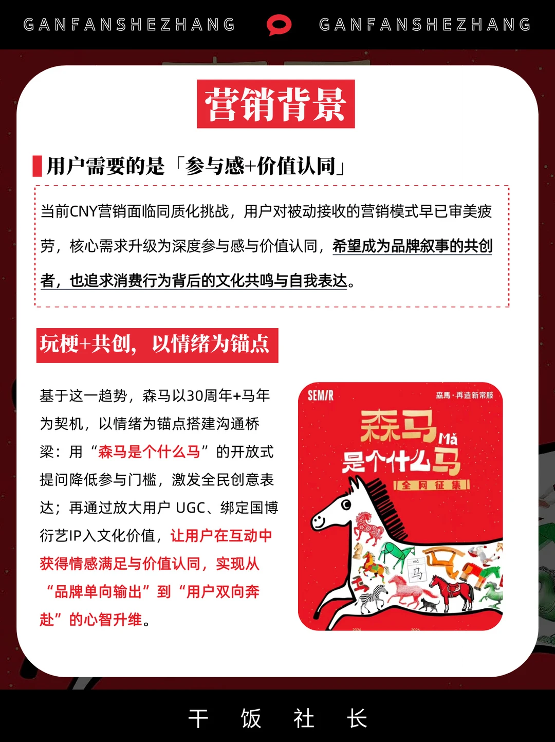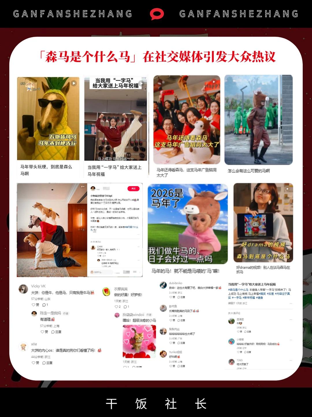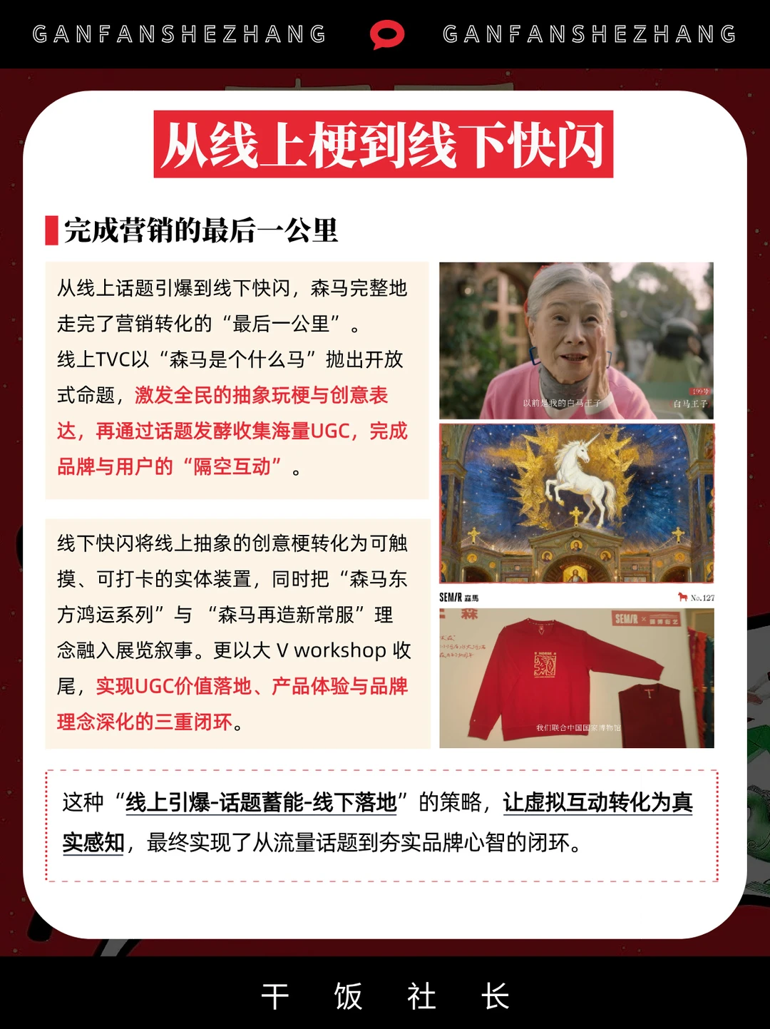 这支TVC并非单纯的内容输出,而是以开放式提问让网友自发参与,形成UGC自发传播的裂变效应。与此同时,森马联名国博衍艺IP推出“森马东方鸿运系列”,品牌将文化内涵注入产品,并落地“森马是个什么马”新年主题快闪,将线上征集的 UGC 创意转化为可打卡的实体装置,作为话题热度的延展。