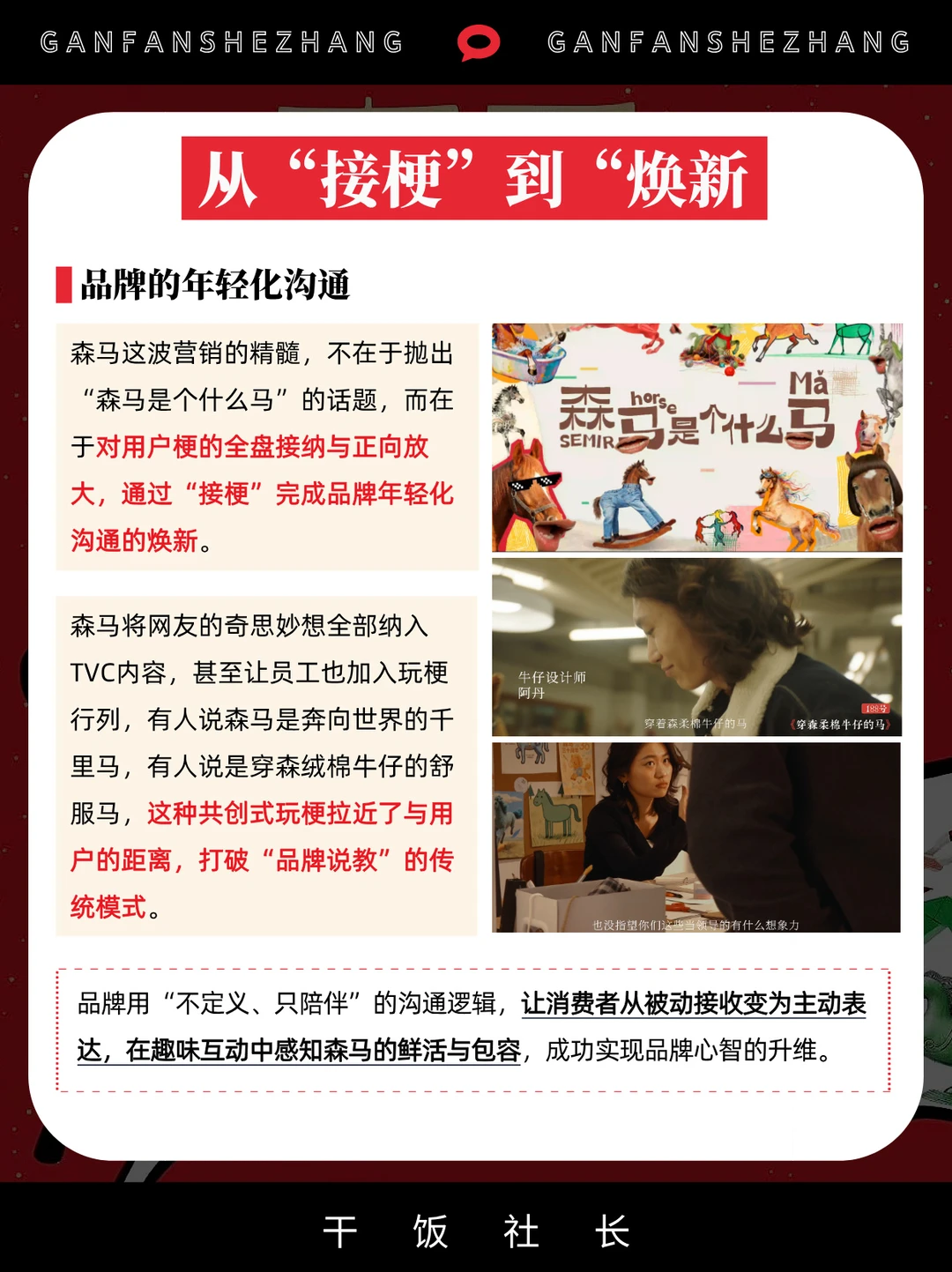 从短片引爆话题,到用户共创玩梗,再到将网友的奇思妙想落地为线下可打卡的实体互动,森马成功让大众在真是参与中,感知其年轻、会玩的品牌样貌。