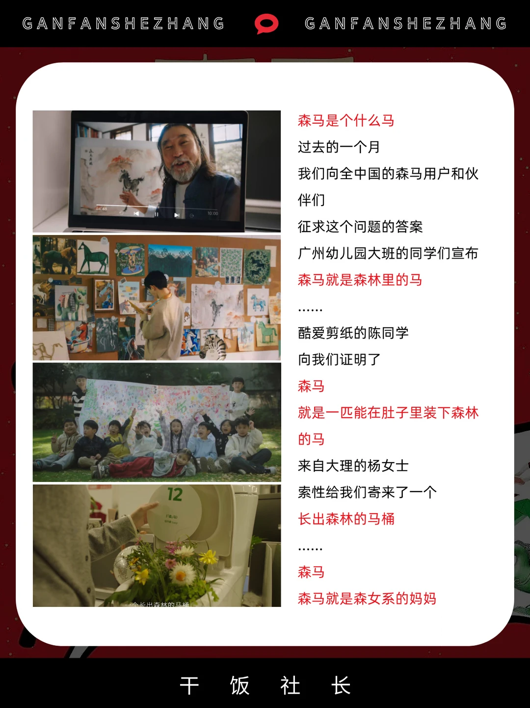 2026年恰逢森马30周年与马年双重契机,品牌推出“森马是个什么马”创意TVC,短片中,从“大家笔下各种涂鸦马”到 “一家三口坐在木马上”,从“森女系妈妈”到“马桶里的森林”,千奇百怪的“马”意象渗透生活方方面面,既呼应马年主题,又以无边界的创意打破品牌与大众的沟通壁垒。