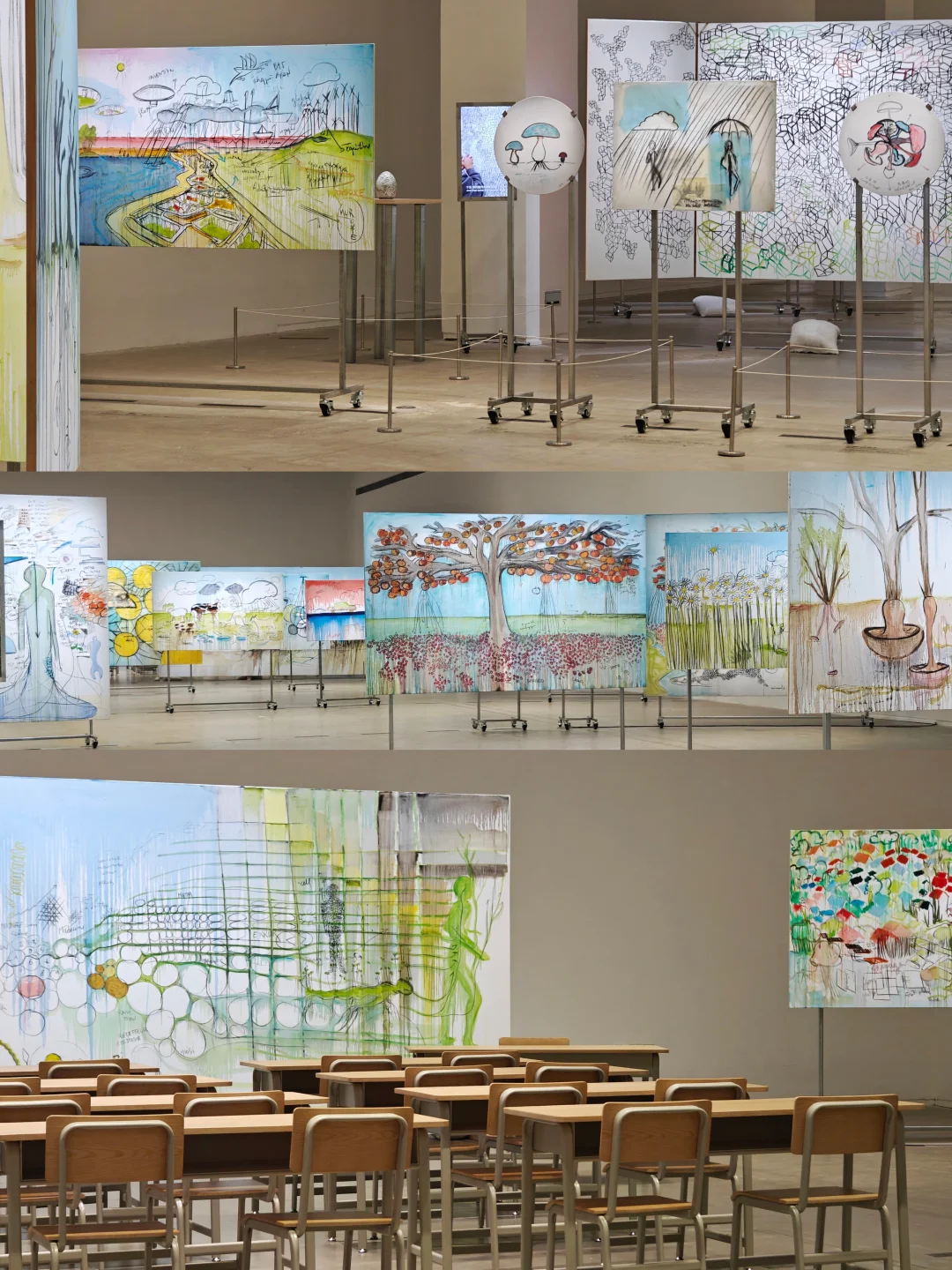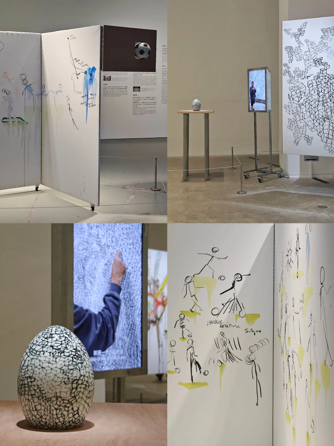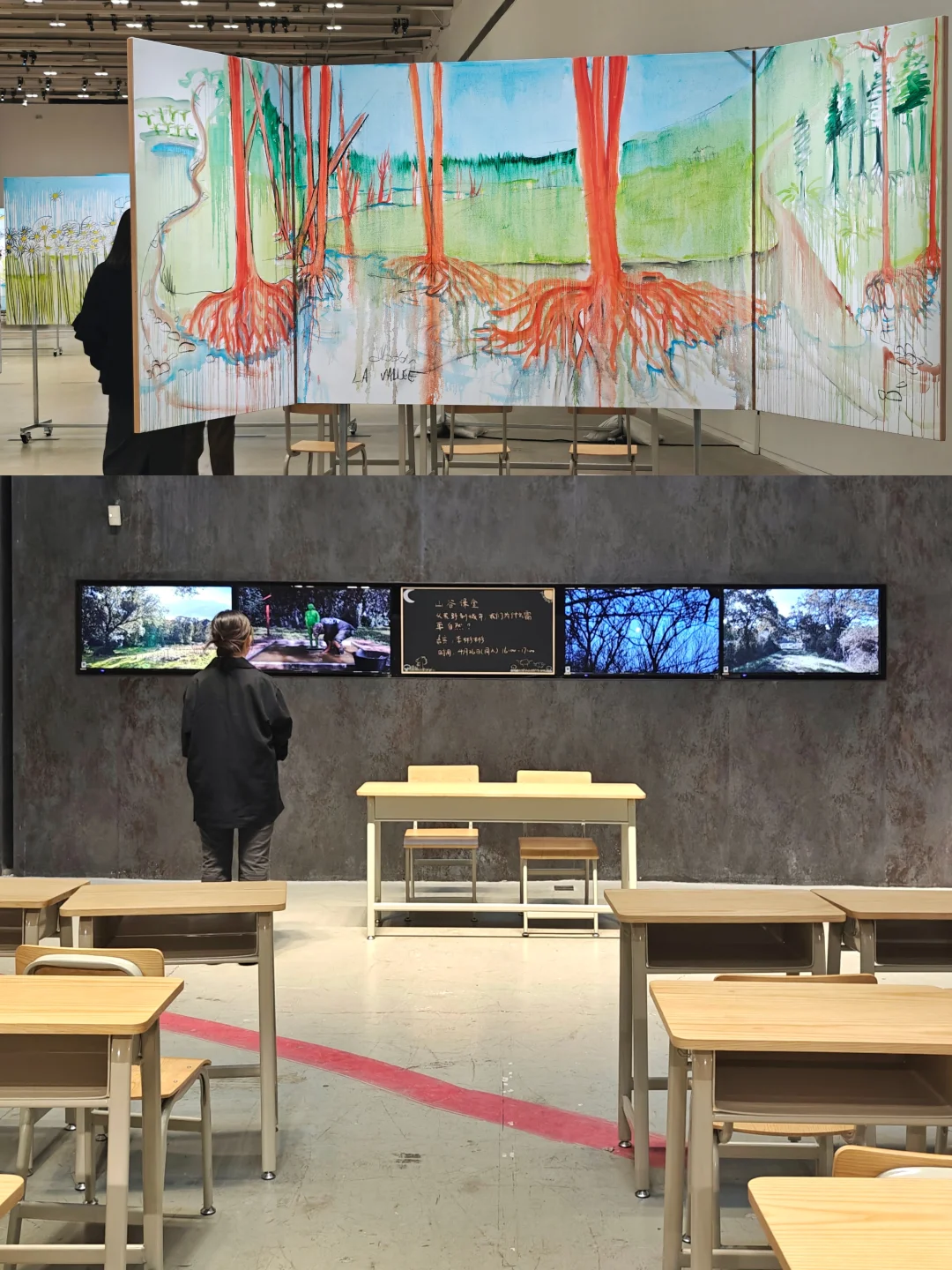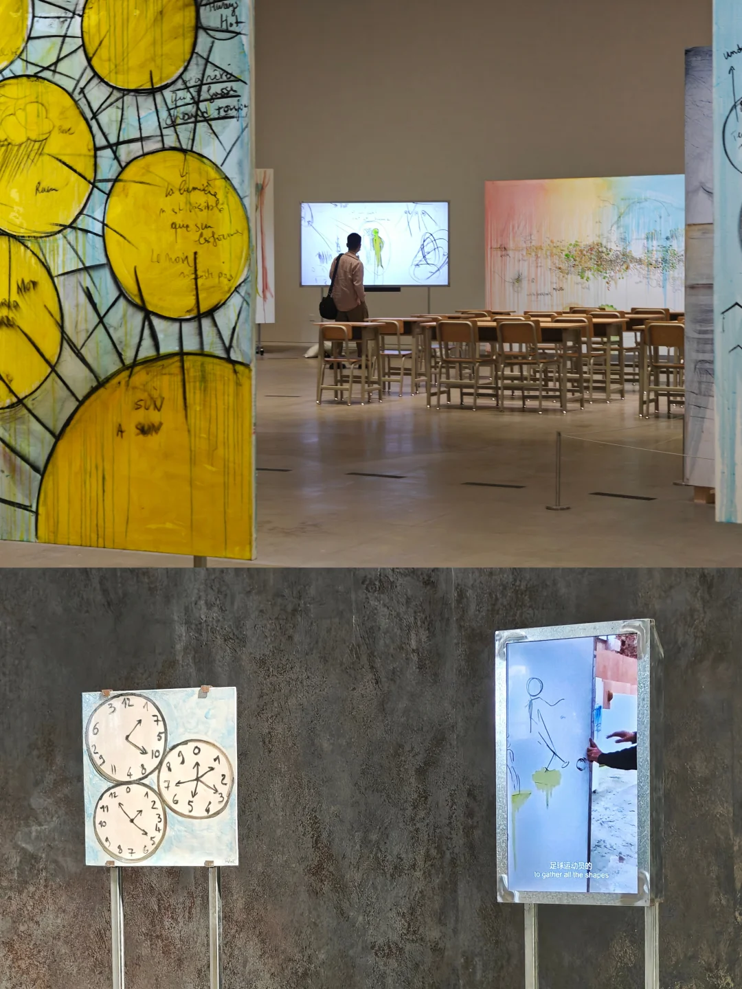 🟢36幅油画与十余幅景德镇瓷板画置于可移动支架上,模拟黑板形式,邀请观众以学习者身份互动。驻地创作的瓷板画为首次亮相,融合釉下彩工艺与中国文化元素。