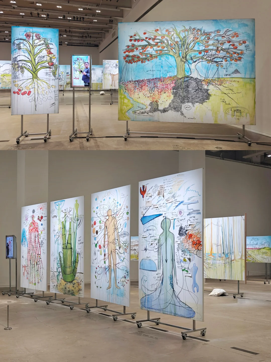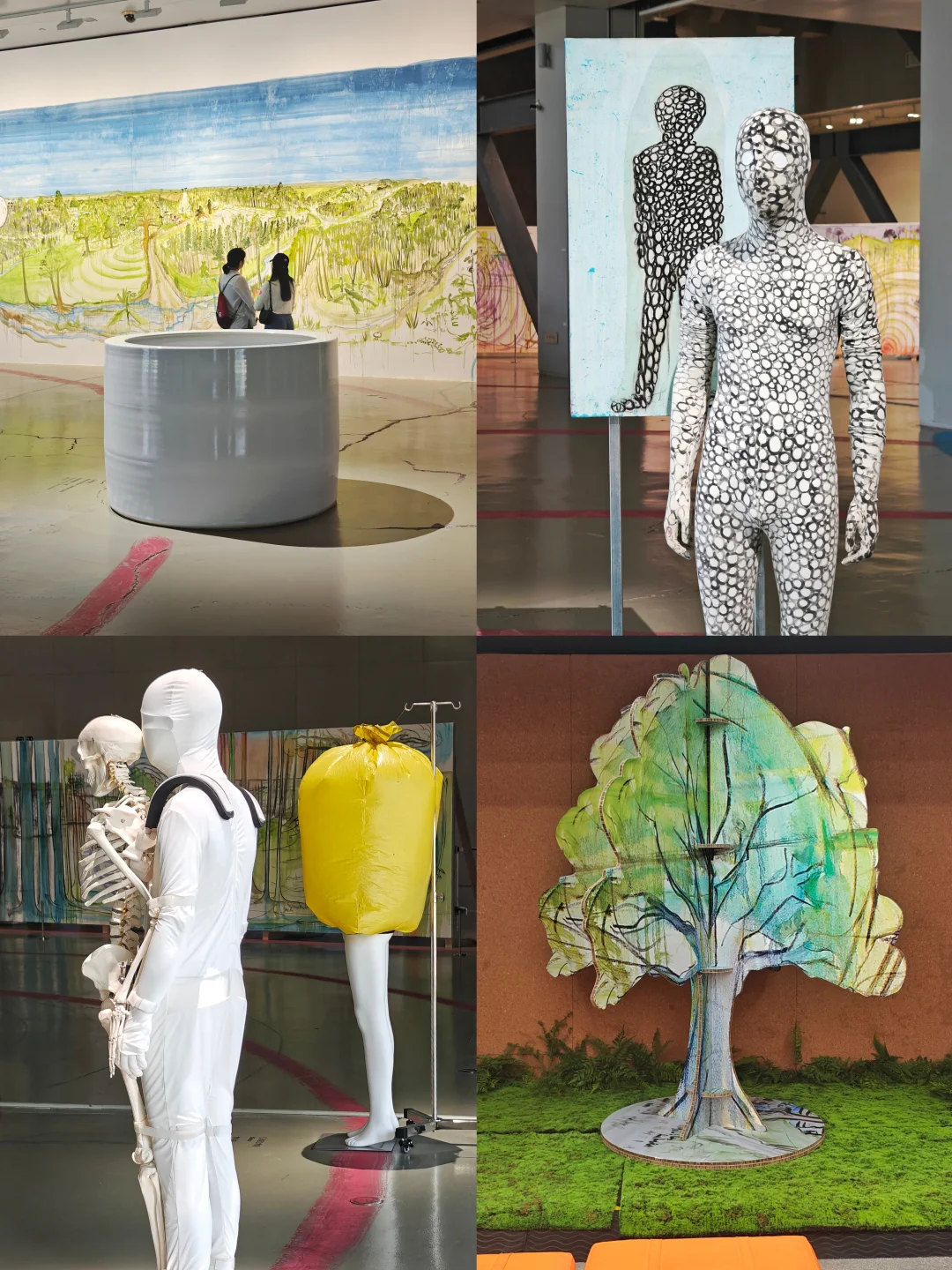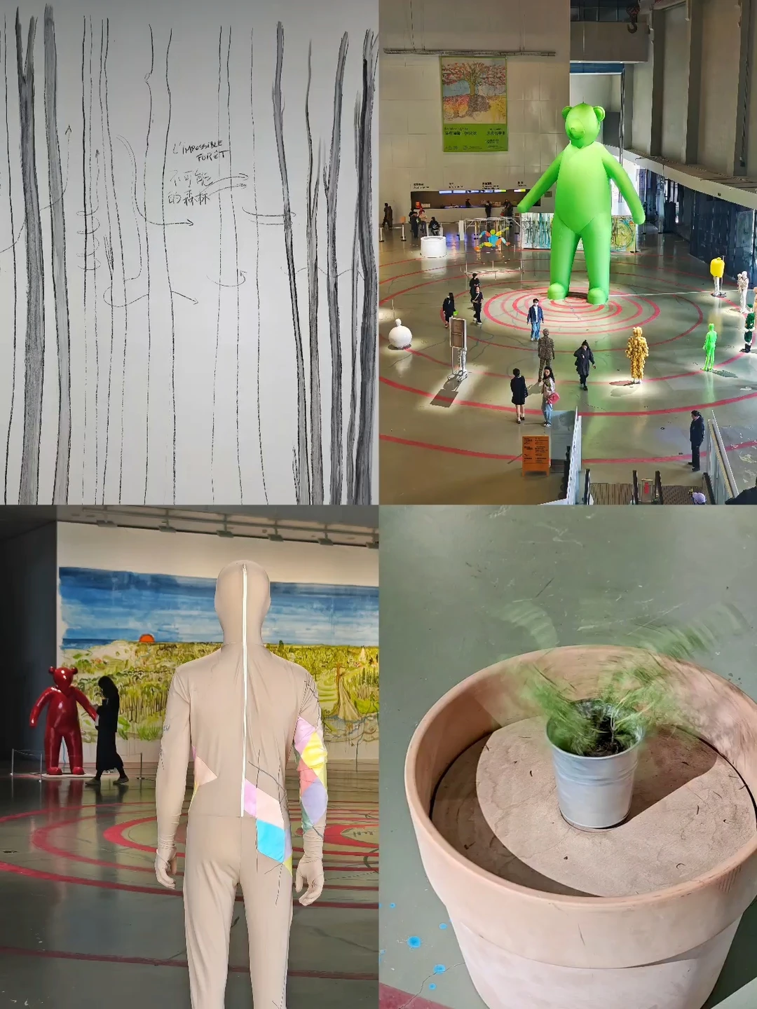 👉个人感受:一进大厅蕞抢眼的自然是大绿熊了,艺术家将地面裂缝填上色彩如同小溪,一个个红圈扩展出去,不同位置上“站”着其他物质构成的“人”;右侧又是一个蓝色圈圈的仪式现场既视感,穿着白色服装的假人围成一圈,周围是“不可能森林”。一旁还有一盆不停旋转把自己甩成疯癫形态的迷迭香,相当迷幻……