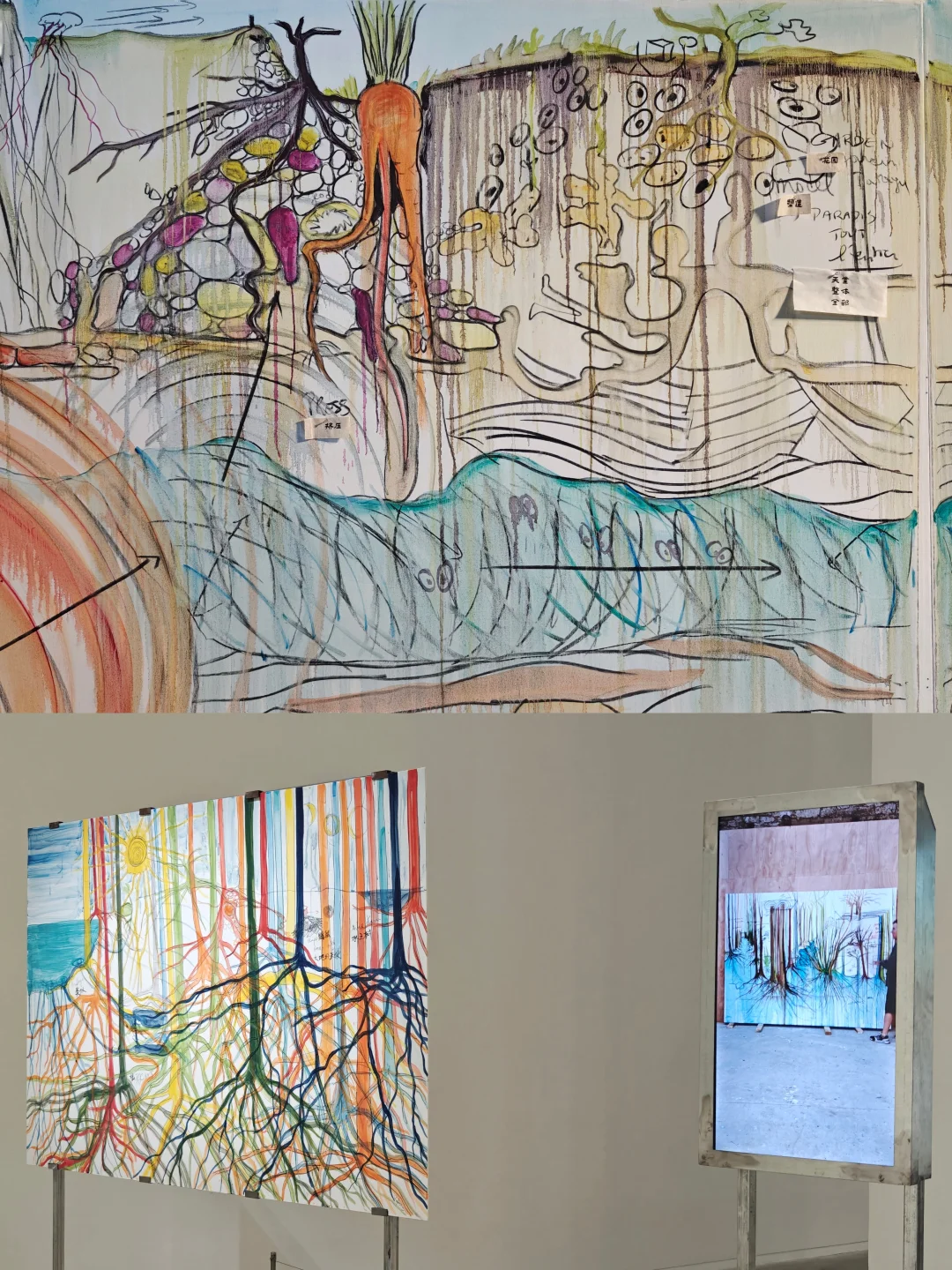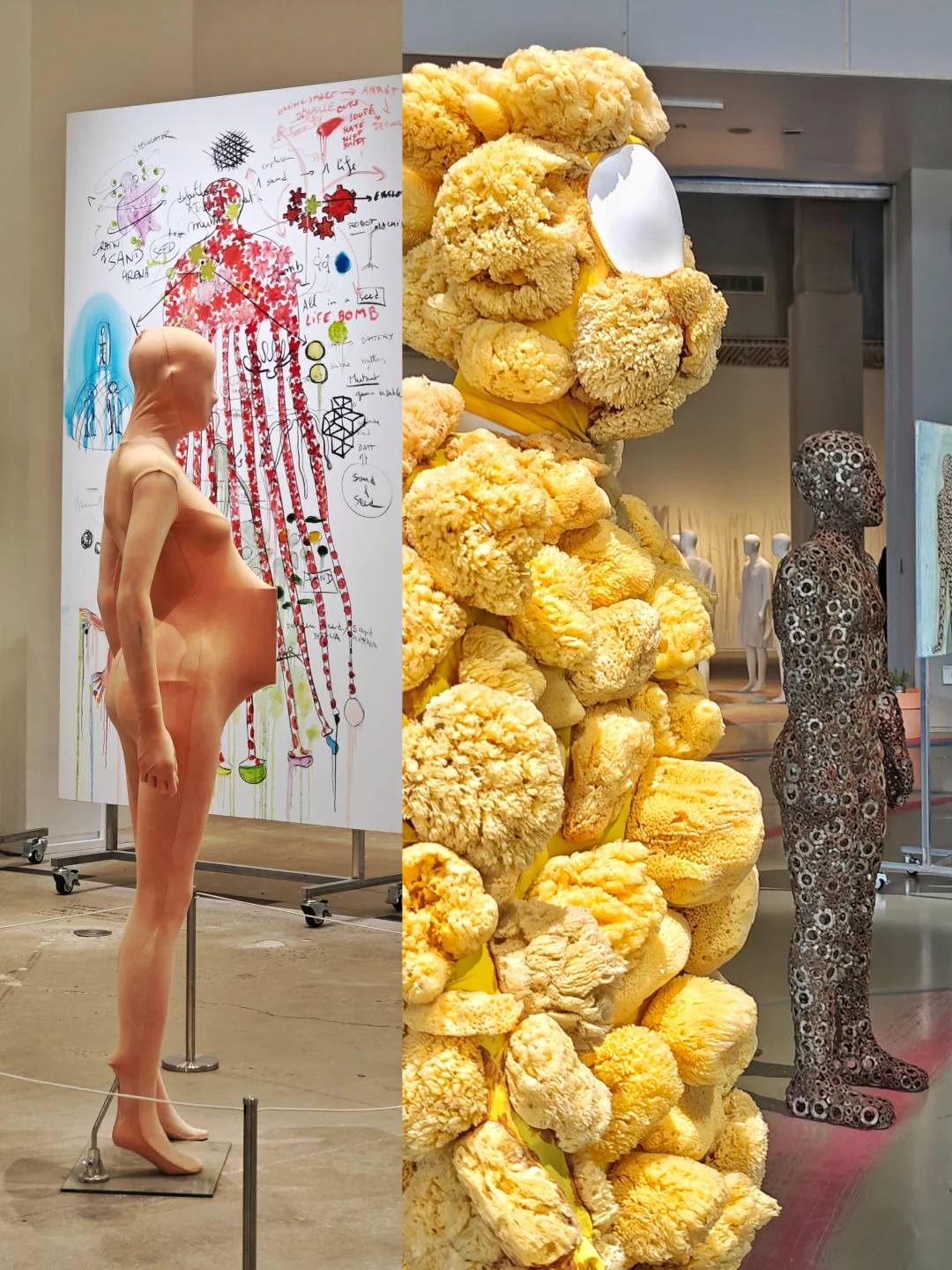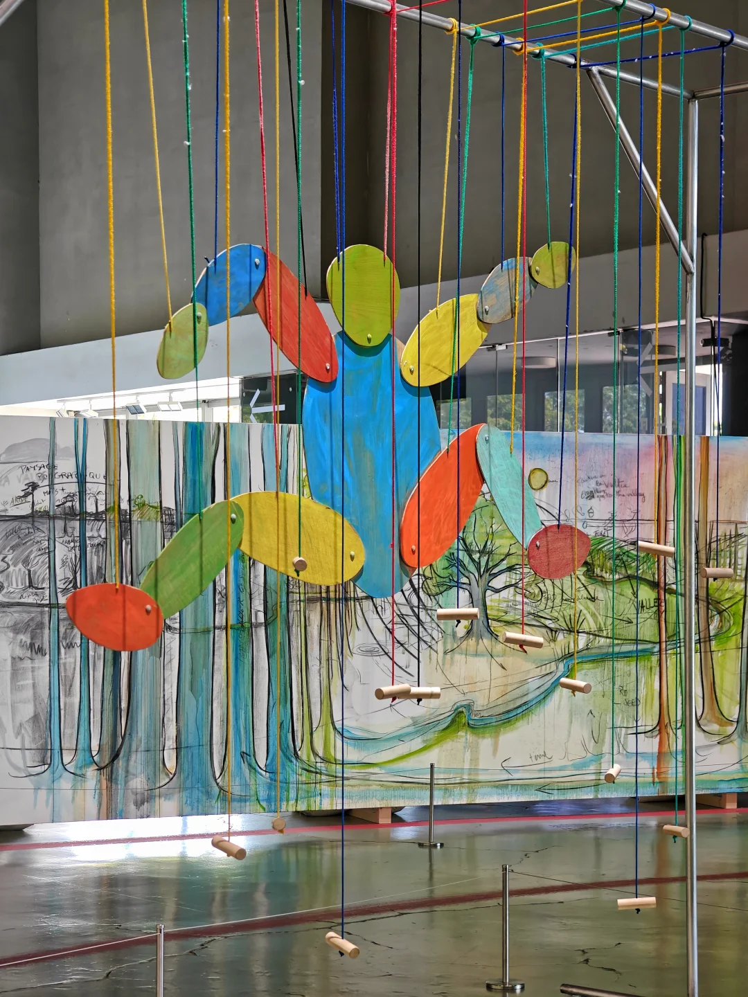 👉个人感受:一进大厅蕞抢眼的自然是大绿熊了,艺术家将地面裂缝填上色彩如同小溪,一个个红圈扩展出去,不同位置上“站”着其他物质构成的“人”;右侧又是一个蓝色圈圈的仪式现场既视感,穿着白色服装的假人围成一圈,周围是“不可能森林”。一旁还有一盆不停旋转把自己甩成疯癫形态的迷迭香,相当迷幻……