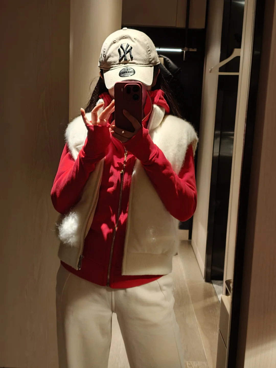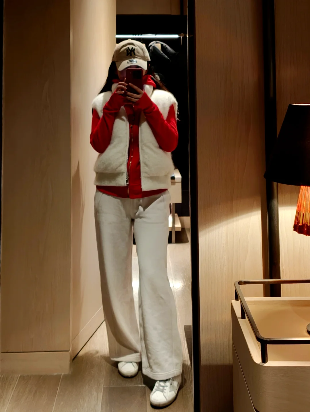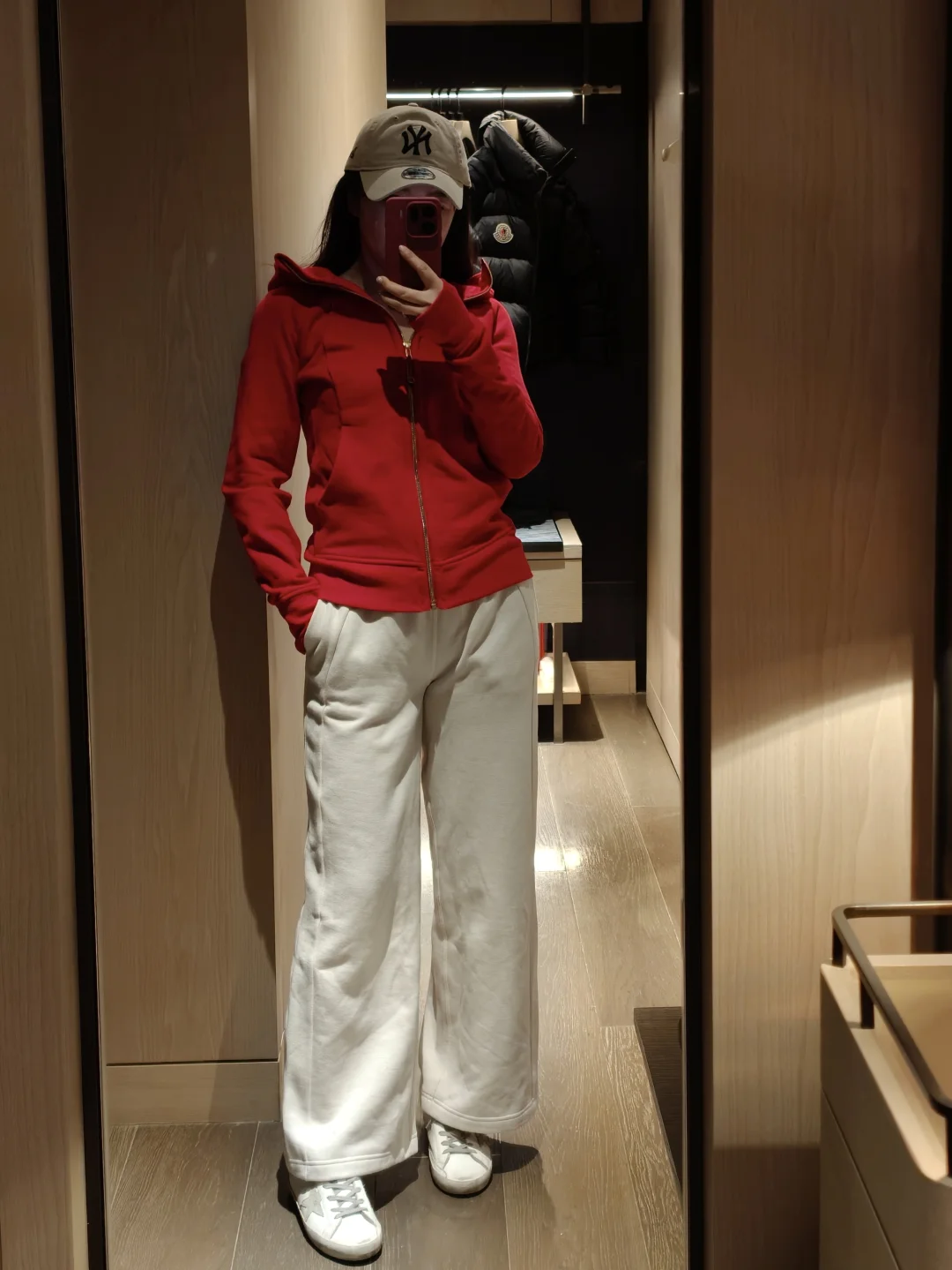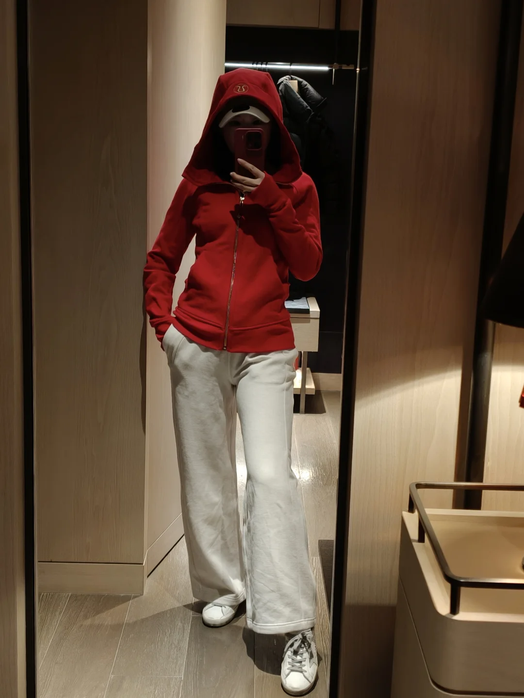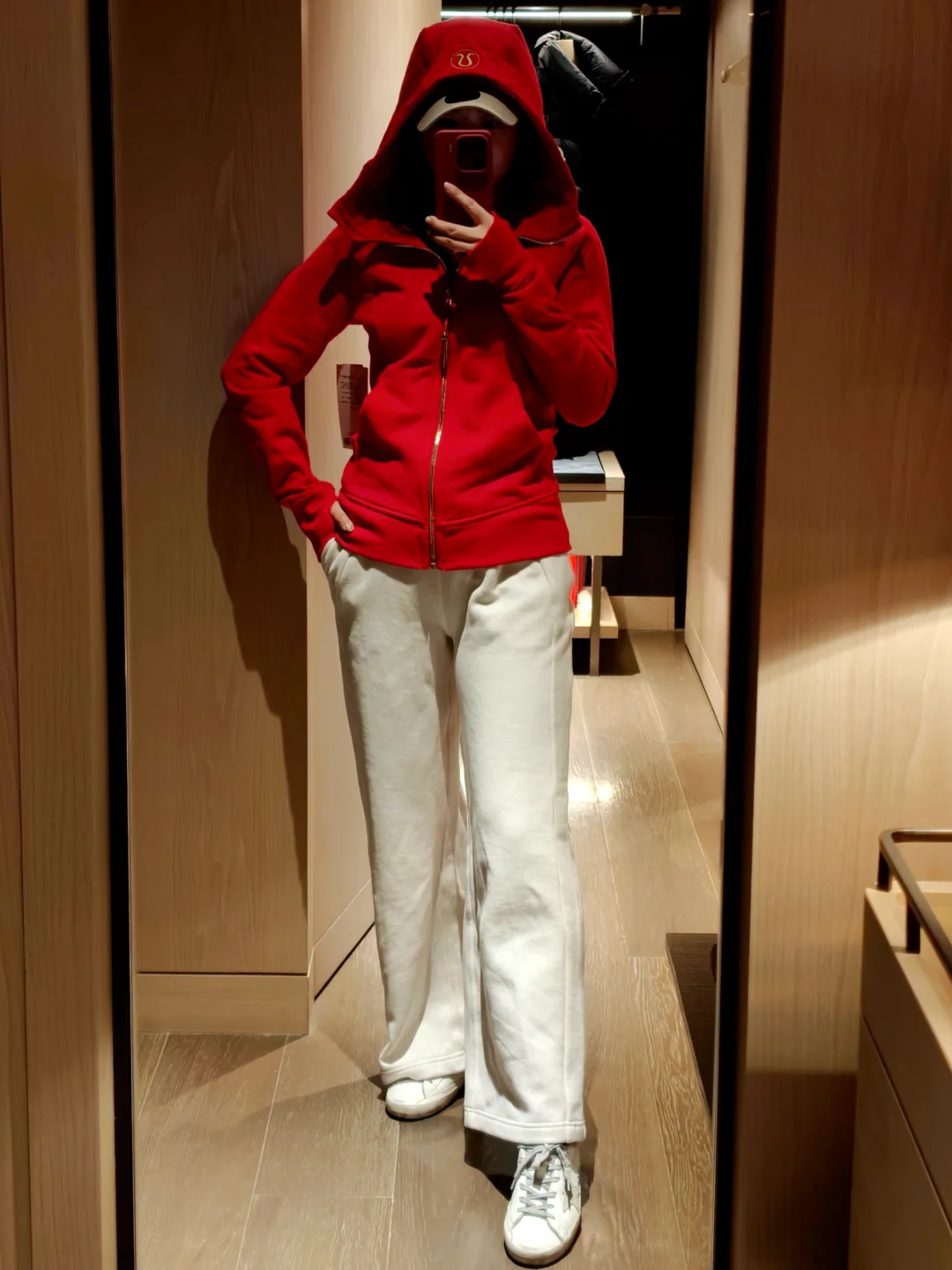 本来想入白色,进店一眼被这件红色吸引,红金搭配很有节日仪式感,剪裁具显身材,新的一年红红火火[鞭炮R] 👚:lululemon scuba 👖:lululemon 加绒阔腿裤 👟:golden goose