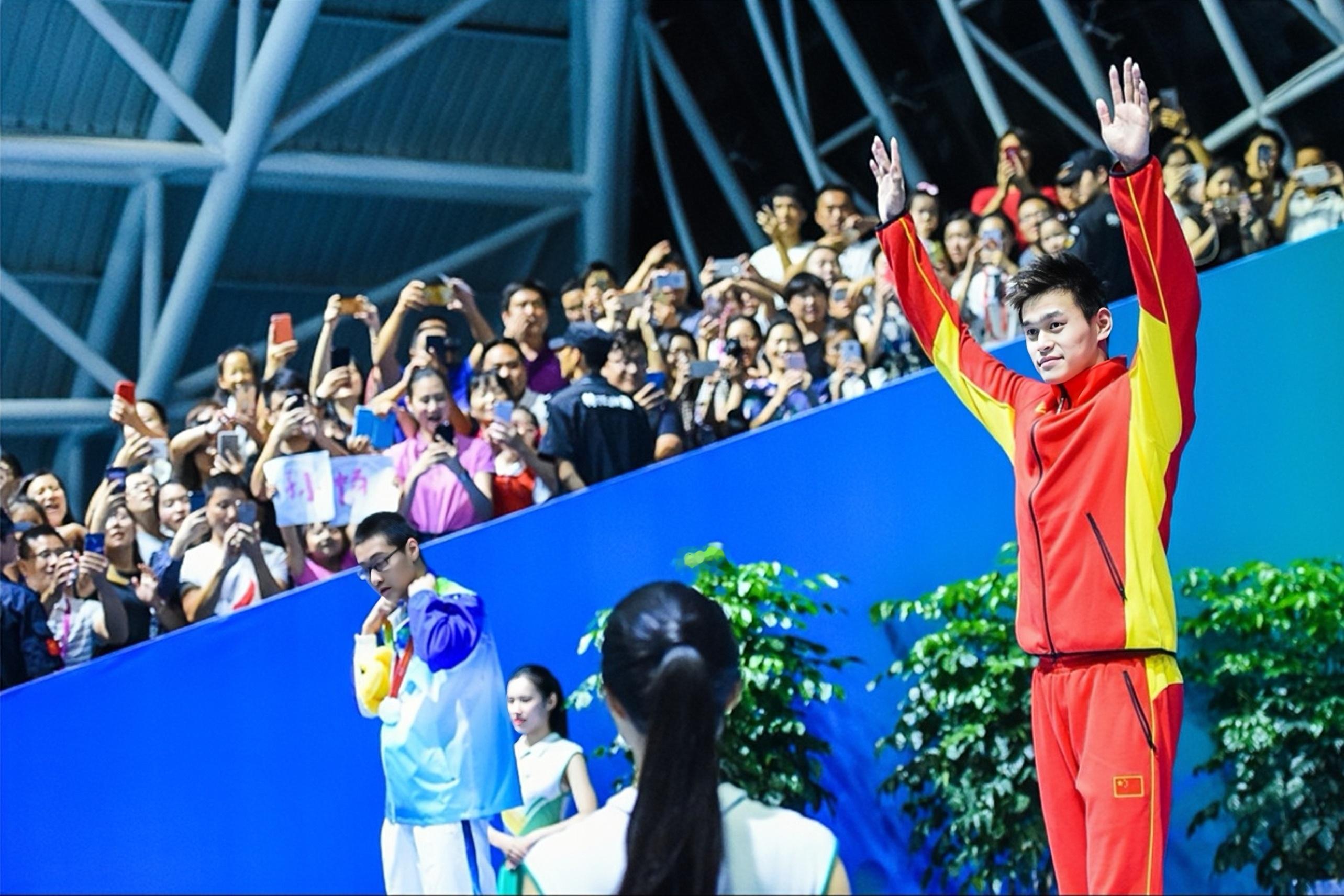 10.9环 『9515』20170911 第十三届全国学生运动会男子400m自由泳决赛颁奖「孙杨在第十三届全国学生运动会上以3分43秒76的成绩获得了大学男子乙组400米自由泳的金牌,并打破了该项目的赛会纪录。颁奖时,孙杨穿着亮灯球鞋出场,有粉丝在看台上大喊:“孙杨你的鞋真好看!”」cr杭州新闻