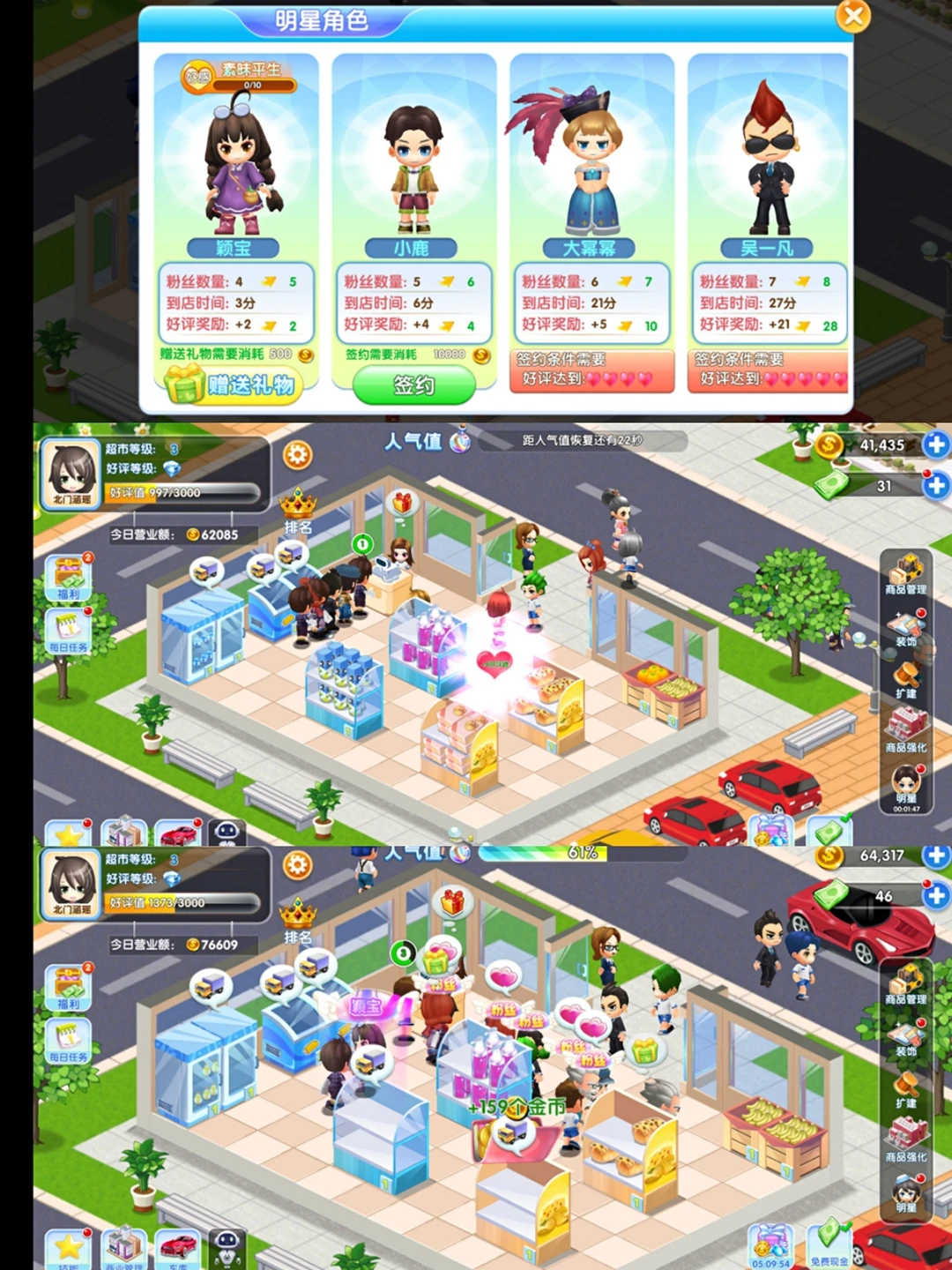 这个和开心商店很相似啊模式基本一样 总之玩起来还是挺爽的 里边还和颖宝小鹿大幂幂等明星签合约宣传 双十一大促也有 但不好的一点是进货时间太长了