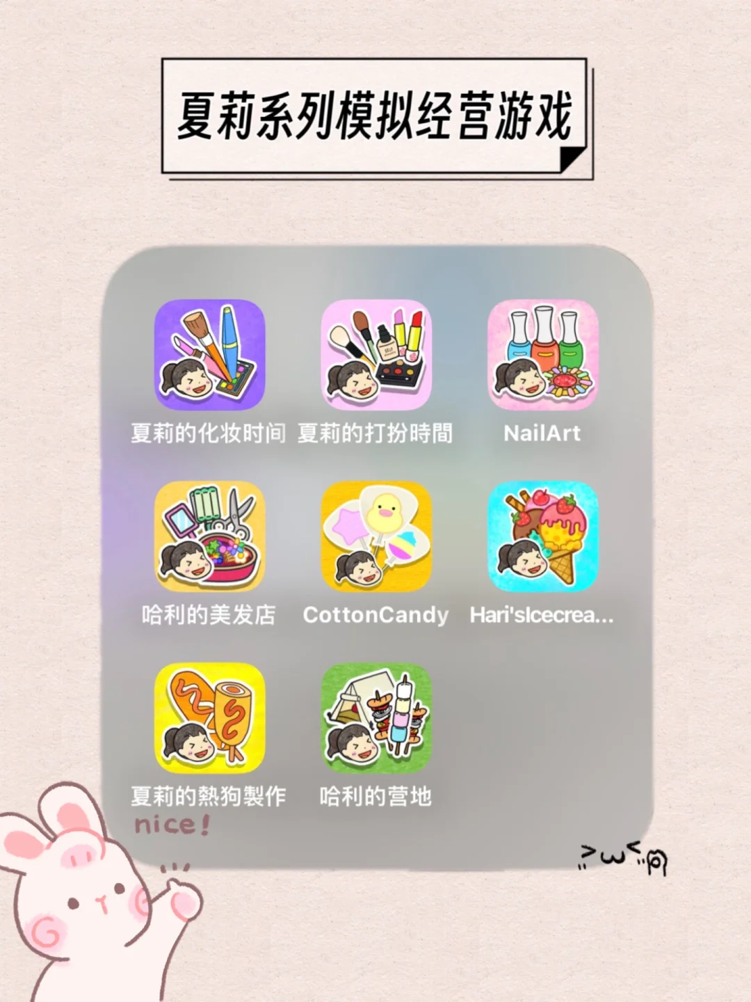 爱玩模拟经营游戏的可以看看这个系列👀 画风清新 过程简短有趣~: * 1️⃣夏莉的打扮时间(Hari’s Makeup) 2️⃣Nail Art 3️⃣哈利的美发店(Hair Shop) 4️⃣夏莉的化妆时间(Hari’s Makeup2) 5️⃣Hari’s Ice Cream Shop 6️⃣夏莉的热狗制作 7️⃣哈利的营地 8️⃣CottonCandy - ✅iOS&Android