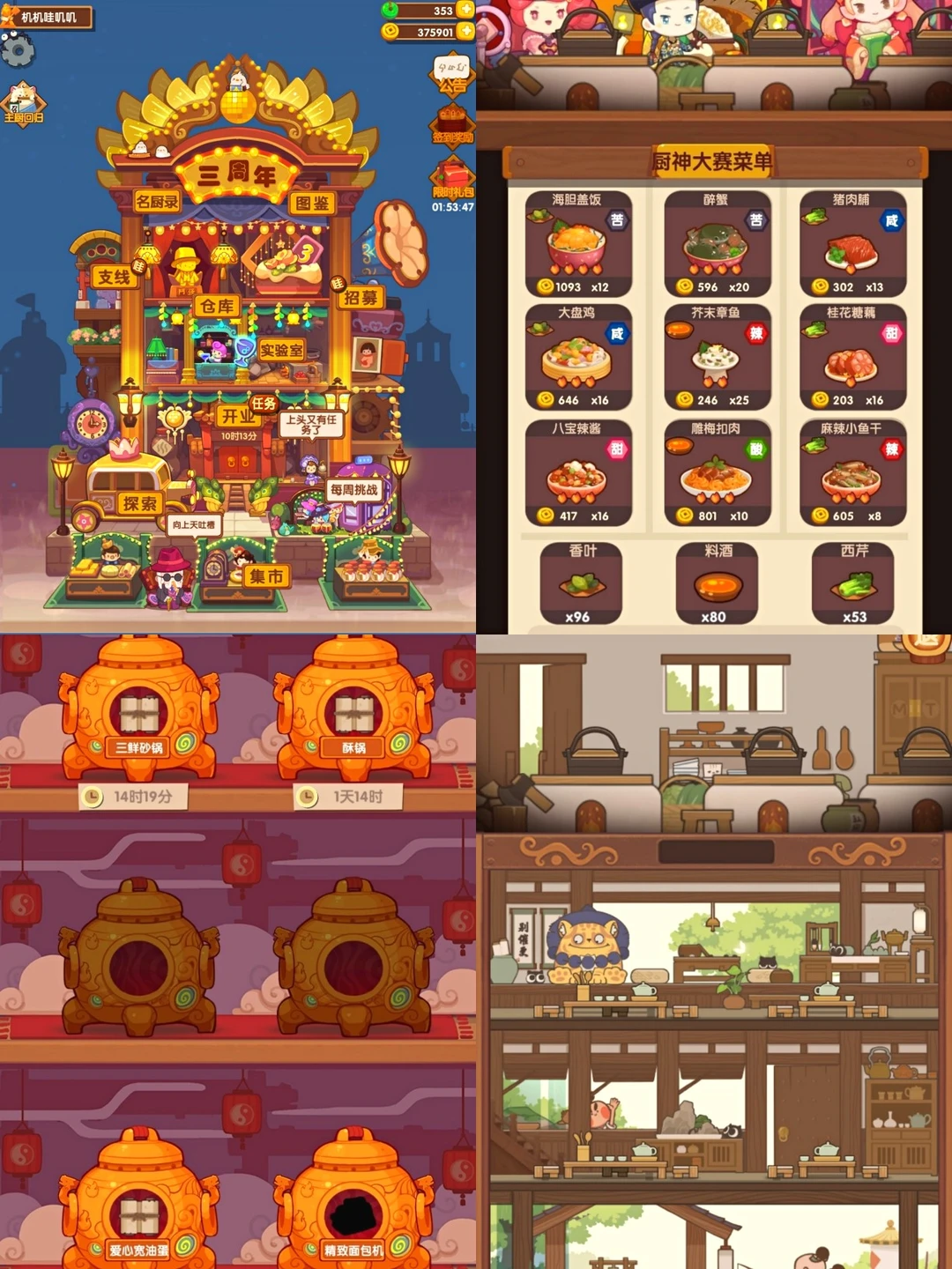 这个游戏很早之前就玩过测试版。最近又拿出来玩了,就是相当于经营一个中华小菜馆。采摘菜品,制作菜肴,聘请厨师,厨师大赛等等……最喜欢的就是里面的做饭环节,画面人物很Q萌
