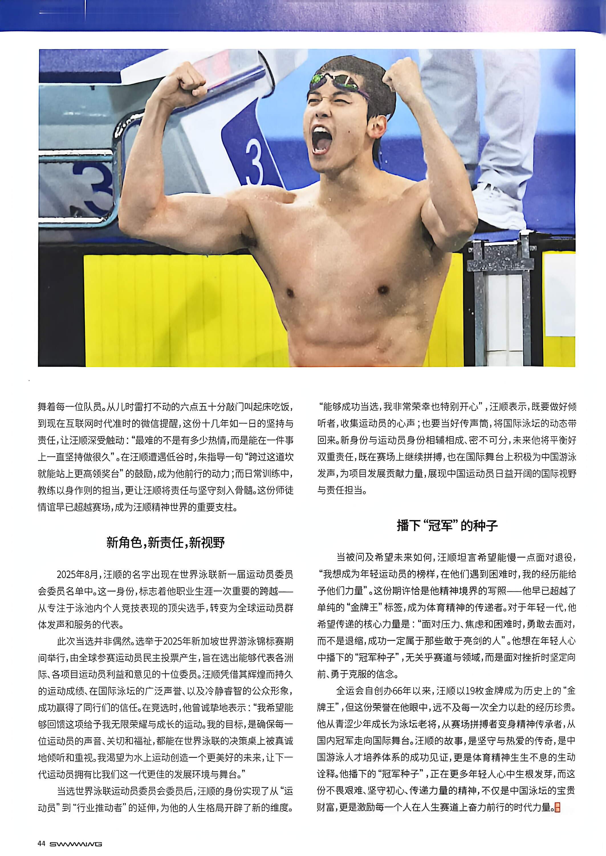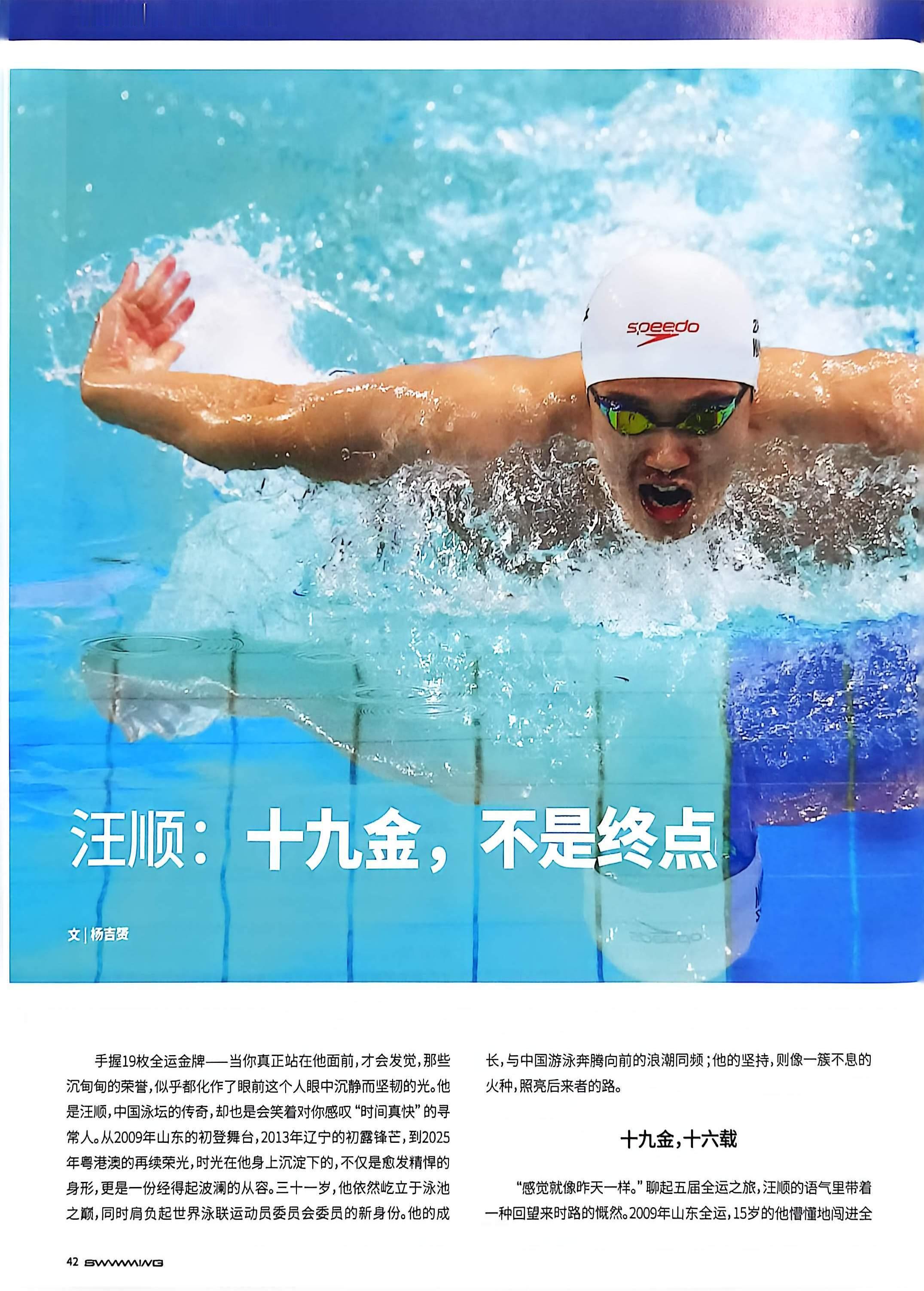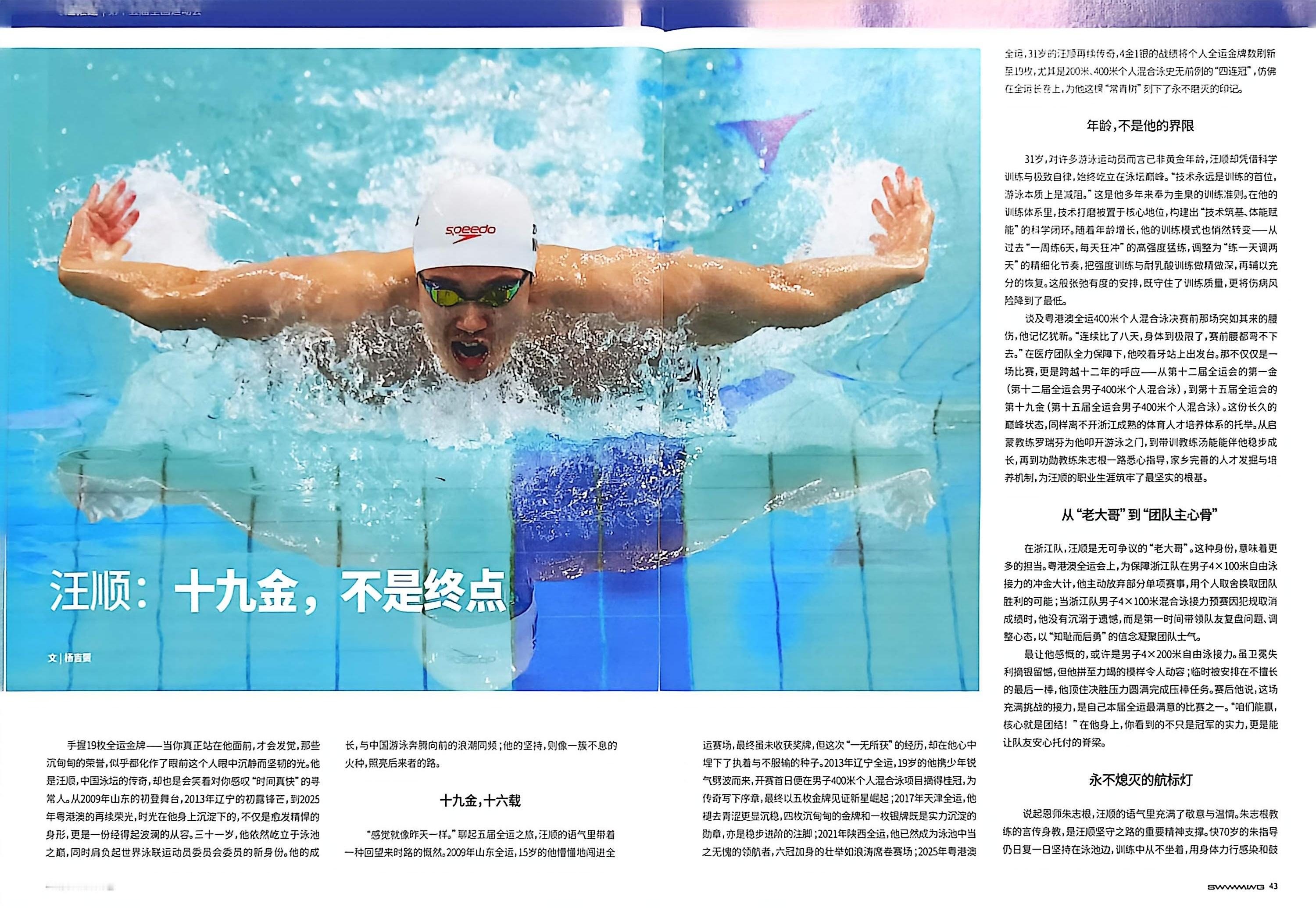 SWim进行时 『9525』《游泳》杂志 2025年第6期双月刊汪顺:十九金,不是终点手握19枚全运金牌——当你真正站在他面前,才会发觉,那些沉甸甸的荣誉,似乎都化作了眼前这个人眼中沉静而坚韧的光。他是汪顺,中国泳坛的传奇,却也是会笑着对你感叹“时间真快”的寻常人。2025年粤港澳全运,31岁的汪顺再续传奇,4金1银的战绩,将个人全运金牌数刷新至19枚,尤其是200m、400m个人混合泳史无前例的四连冠,仿佛在全运长卷上为他这棵常青树刻下了永不磨灭的印记。谈及粤港澳全运400m个人混合泳决赛前那场突如其来的腰伤,他记忆犹新。“连续比了8天,身体到极限了,赛前腰都弯不下去。”在医疗团队全力保障下,他咬着牙站上出发台,那不仅仅是一场比赛,更是跨越12年的呼应。粤港澳全运会上为保障浙江队在男子4×100m自由泳接力的冲金大计,他主动放弃部分单项赛事,用个人取舍换取团队胜利的可能; 当浙江队男子4×100m混合泳接力预赛因犯规取消成绩时,他没有沉溺于遗憾,而是第一时先带领队友复盘问题、调整心态,以“知耻而后勇”的信念凝聚团队士气。最让他感慨的或许是男子4×200m自由泳接力。虽然卫冕失利,摘银流憾,但他拼至力竭的模样令人动容; 临时被安排在不擅长的最后一棒,他顶住决胜压力圆满完成压棒任务。赛后他说,这场充满挑战的接力是自己本届全运最满意的比赛之一。“咱们能赢,核心就是团结!” 在他身上,你看到的不只是冠军的实力,更是能让队友安心托付的脊梁。当被问及希望未来如何,汪顺坦言希望能慢一点面对退役。“我想成为年轻运动员的榜样,在他们遇到困难时,我的经历能给予他们力量。”这份期许恰是他精神精神境界的写照,他早已超越了单纯的金牌王标签,成为体育精神的传递者。对于年轻一代,他希望传递的核心力量是:面对压力、焦虑和困难时,勇敢去面对,而不是退缩,成功一定属于那些敢于亮剑的人。他想在年轻人心中播下冠军种子,无关乎赛道与领域,而是面对挫折时坚定向前,勇于克服的信念。cr游泳杂志