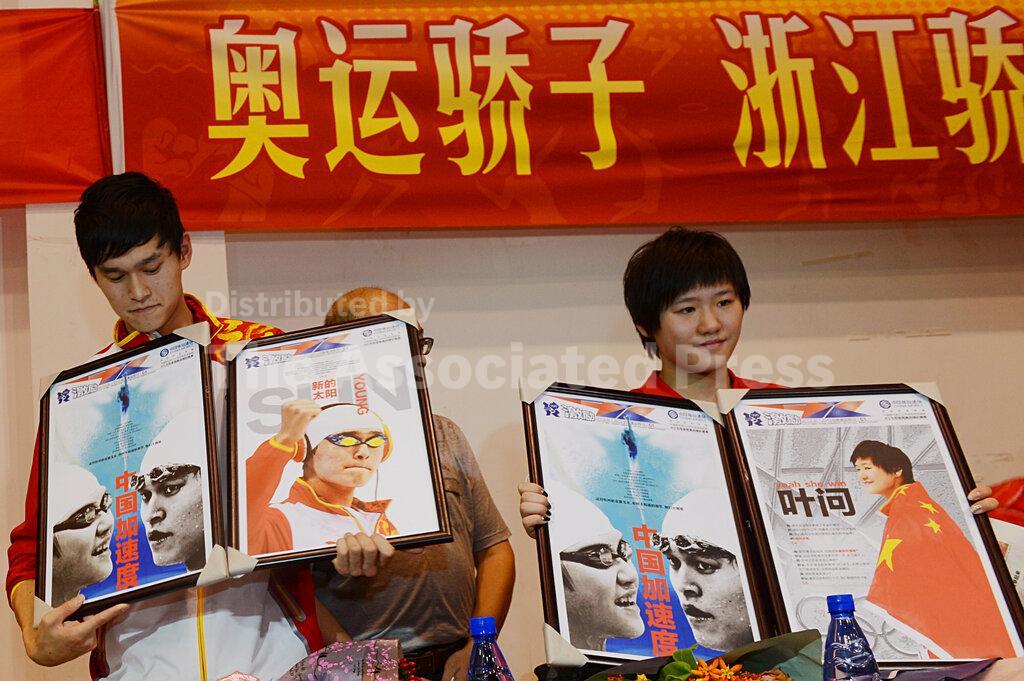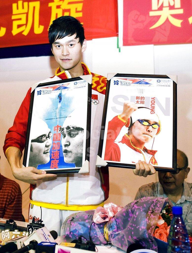 10.9环 『9527』20120808 伦敦奥运会欢迎仪式“新的太阳。”2012年8月8日,奥运冠军孙杨在中国东部浙江省杭州市的欢迎仪式上留影。本周三(8月8日),孙杨与叶诗文这两位中国奥运游泳冠军回到家乡杭州,受到了英雄般的欢迎。21岁的孙杨打破了400米自由泳奥运纪录,成为首位获得奥运游泳金牌的中国男运动员。他还斩获了200米自由泳银牌,并刷新了自己保持的1500米个人自由泳纪录,助力中国游泳队将金牌总数提升至五枚。Chinese Olympic swimming champion Sun Yang is pictured during a welcome ceremony in Hangzhou city, east Chinas Zhejiang province, 8 August 2012. Chinese Olympic swimming champions Sun Yang and Ye Shiwen received a heros welcome as they arrived at their hometown Hangzhou on Wednesday (8 August 2012). Sun, 21, broke the Olympic record in 400m freestyle and became the first Chinese man to win an Olympic swimming gold. He also bagged a silver in 200m freestyle, and smashed his own 1500m individual freestyle to help the Chinese swimming team s gold medal tally to five. cr美联社