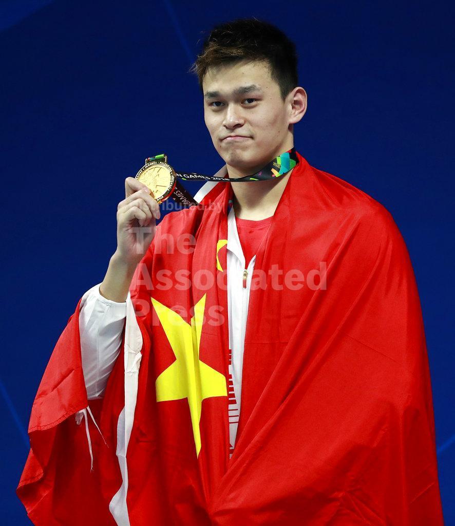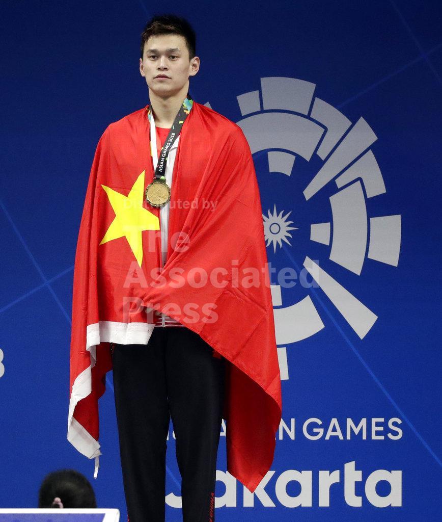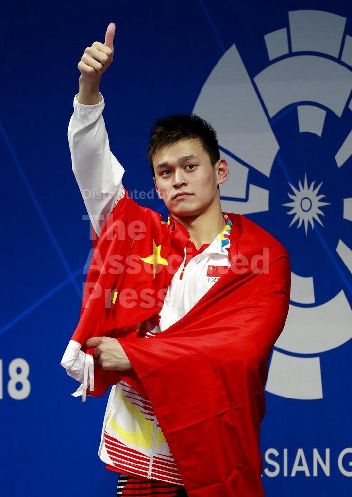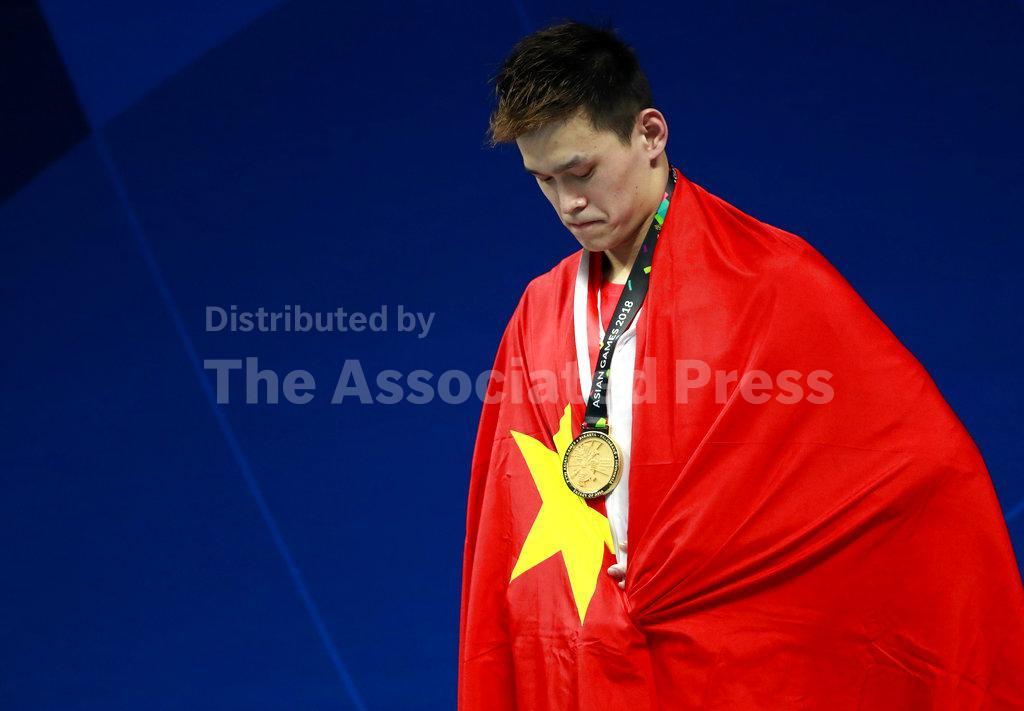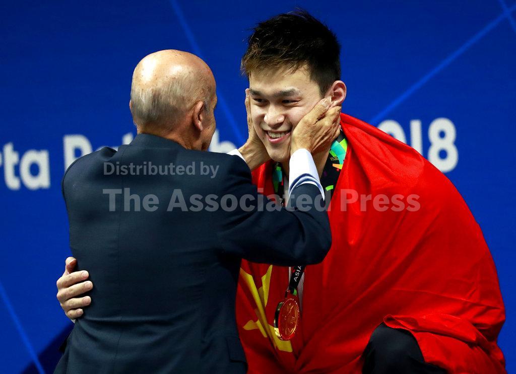 10.9环 『9528』20180820 雅加达亚运会男子800m自由泳颁奖仪式远看是黄毛小子,近看是捧脸小🐽2018年8月20日,星期一,在印度尼西亚雅加达举行的第18届亚洲运动会游泳比赛中,中国选手孙杨(右)在男子800米自由泳决赛中夺得金牌后,受到颁奖台上一位官员的拥抱。China's Sun Yang, right, is embraced by a official on the podium after winning the gold medal in the men's 800m freestyle final during the swimming competition at the 18th Asian Games in Jakarta, Indonesia, Monday, Aug. 20, 2018. cr美联社