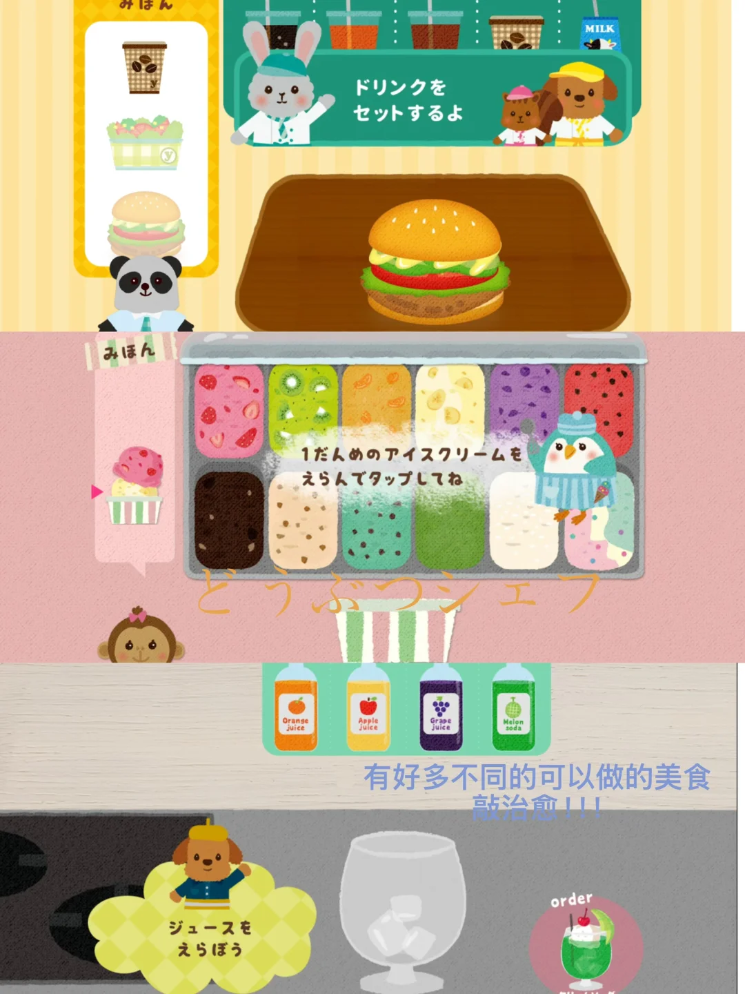包含冰淇淋、可丽饼、咖啡、汉堡、塔可等等经营制作,一步一步的很有意思。画风很nice,音效也很不错 沉浸式的体验 很治愈~
