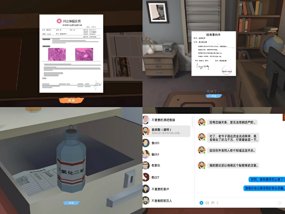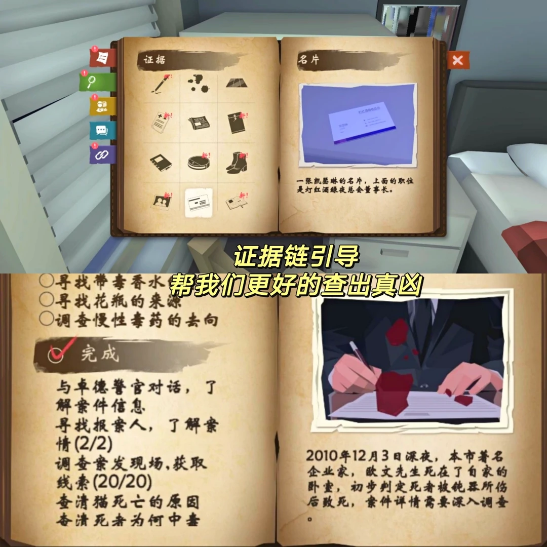 🔅APP: 致命的遗嘱 🔅解谜/悬疑/冒险/烧脑/3D _ 富豪惨死家中,嫌疑人竟是身边最亲近之人。 是眼前的利益使然,还是积攒多年的复仇。 反锁的窗户 死去的猫 浴室未烧开的热水器 过于平静的儿子 矛盾的女仆 看似迷糊的检修员 每个嫌疑人都有不在场证明 一切都隐隐透露着诡异。 作为侦探,你需要亲临现场,搜索物证,分析线索,得出结论,指证凶手,还原真相。 - 🔅3D交互 第一人称视角 🔅搜证真实感很强 必须走近才能搜到 不然就忽略了 🔅场景建模我真的喜欢 🔅合成证据链 挺烧脑的 🔅沉浸式探案剧本杀 悬疑味儿很足 ❌对晕3D者不太友好 会晕晕😵 操作手感不是特别好 好多解谜有点难 - 周日快乐[扯脸H][扯脸H]