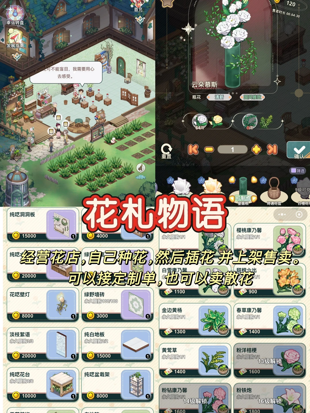 一个可以经营花店的小游戏,开发新花品种、探索不同的花瓶和包装,自己种花收花,根据客人需求插花,并摆台售卖。同时别忘记装修花店 可以装修成自己喜欢的风格。喜欢模拟经营的不要错过。