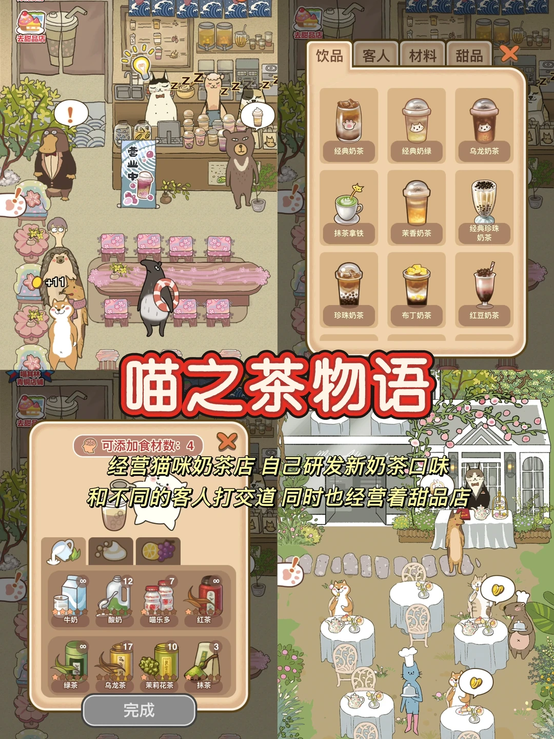 经营猫咪奶茶店,招待不同的动物朋友。研发新奶茶和新甜品,很有意思,因为自己配料,最好找找攻略,不然很容易浪费材料。有时还要和不同的客人对话,超级治愈,就像真的在森林里开了一家店似的!