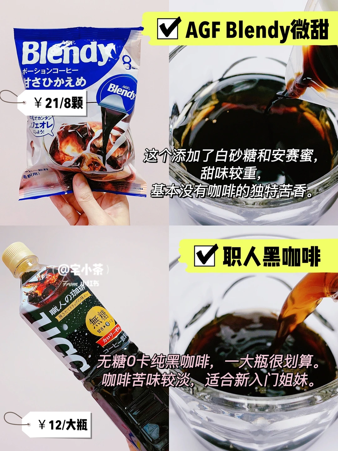 原味无糖的,后味饱满有回甘;微甜的甜度稍高,比较适合不爱苦咖啡的姐妹。
