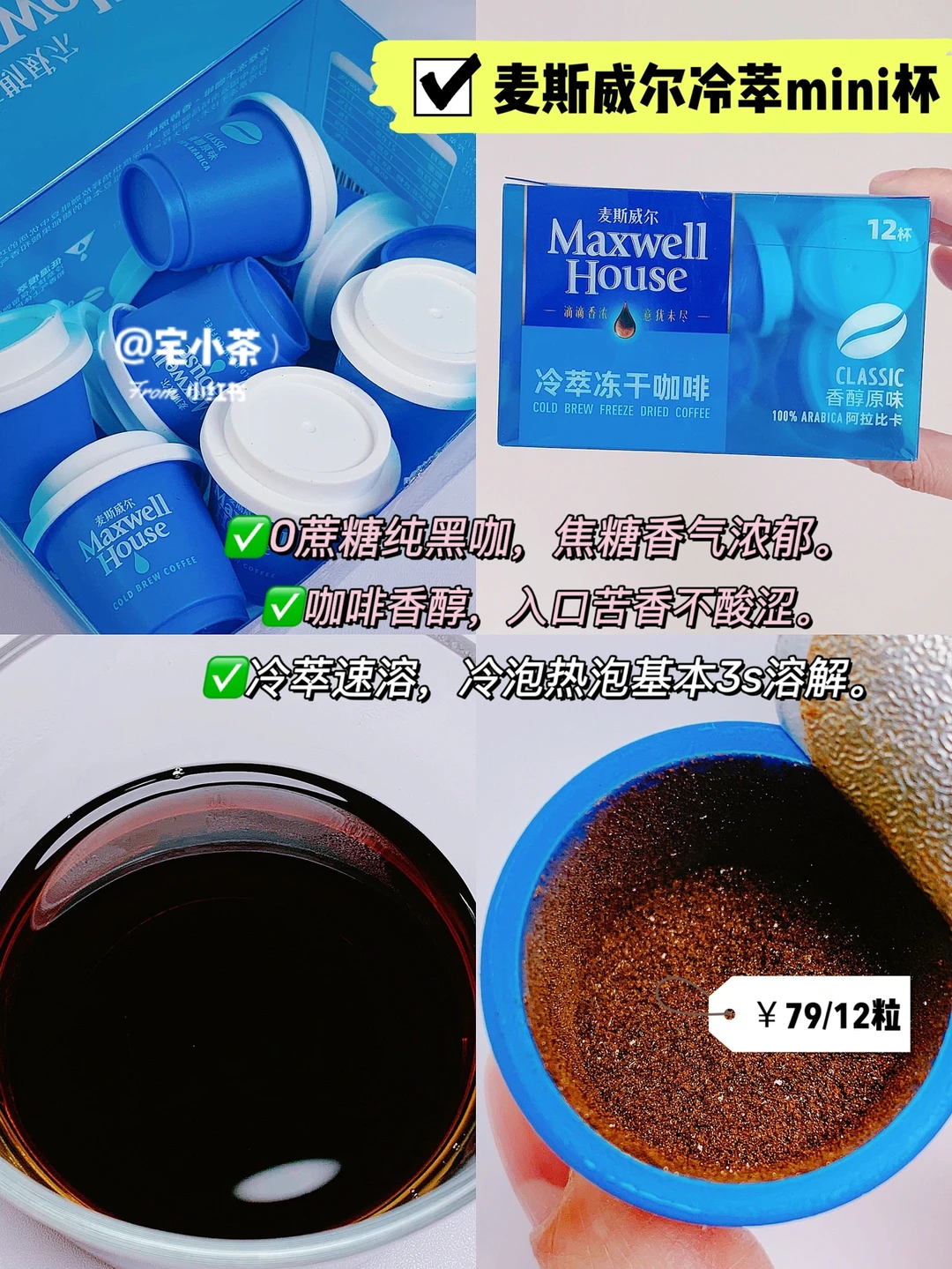 1️⃣可可爱爱的麦斯威尔冷萃mini杯!纯黑咖啡,焦糖香气浓郁,咖啡香醇,入口苦香不酸涩。因为咖啡足够香醇,不需要搭配牛奶or燕麦奶就很好喝。