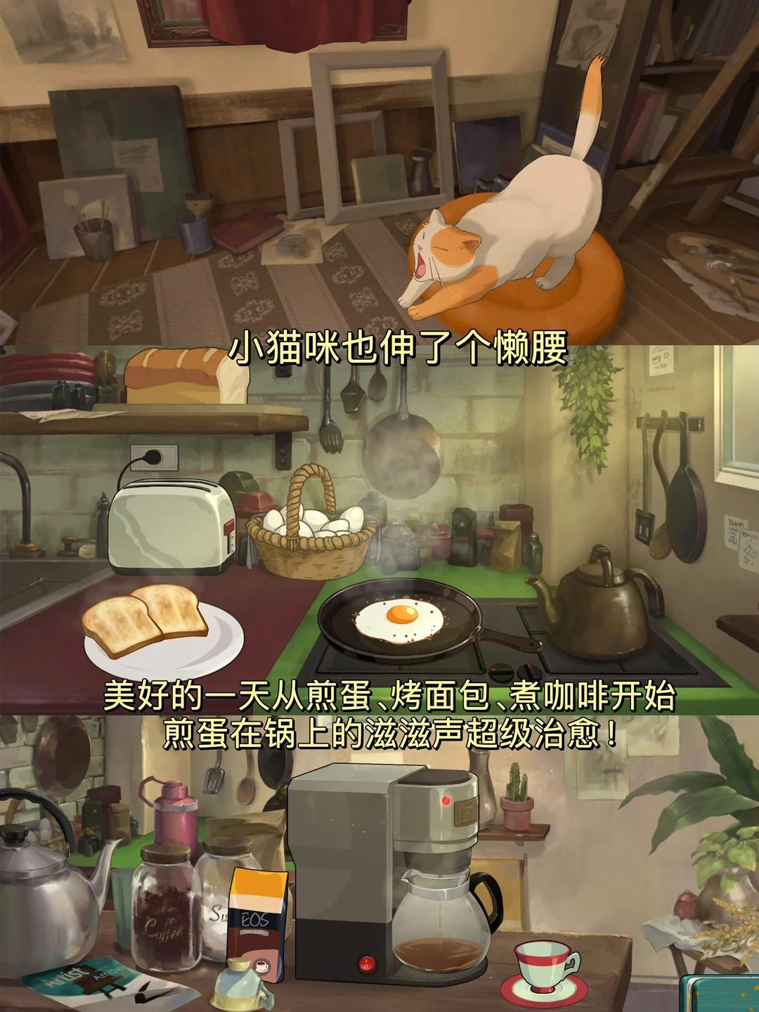 🍈煎蛋煮咖啡的声音、和物品互动的清脆声响、画笔掉落地上都声音、窗外下雨的哗哗声,调皮的猫咪,这些细节生动又形象,很难想象这仅是一个游戏