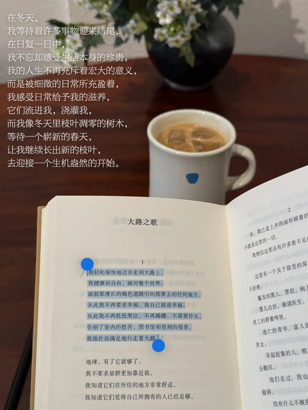 我等待许多事物迎来结尾,在日复一日中,我不忘却感受生活本身的珍贵,我的人生不再充斥宏大的意义,而是被细微的日常所充盈,它们流进我,浇灌我,我像冬天里枝叶凋零的树木,等待崭新的春天,长出新的枝叶,去迎接生机盎然的开始。
