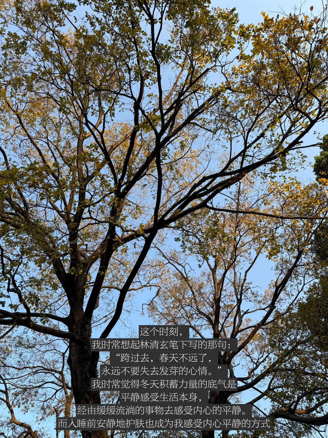 我清楚感受到,生活不在别处,就在我眼前的、我所感知的此时此刻。这个时刻,我时常想起林清玄笔下写的那句:“跨过去,春天不远了,永远不要失去发芽的心情。”
