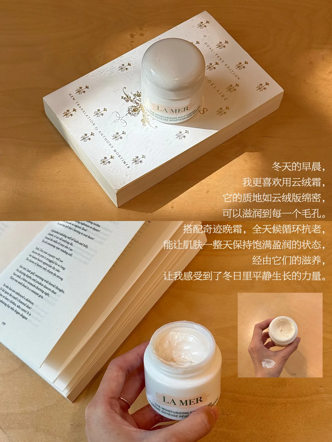 冬天的早晨,我更喜欢用云绒霜,它的质地如云绒版绵密,可以滋润到每一个毛孔。搭配奇迹晚霜,全天候循环抗老,能让肌肤一整天保持饱满盈润的状态,经由它们的滋养,让我感受到了冬日里平静生长的力量。