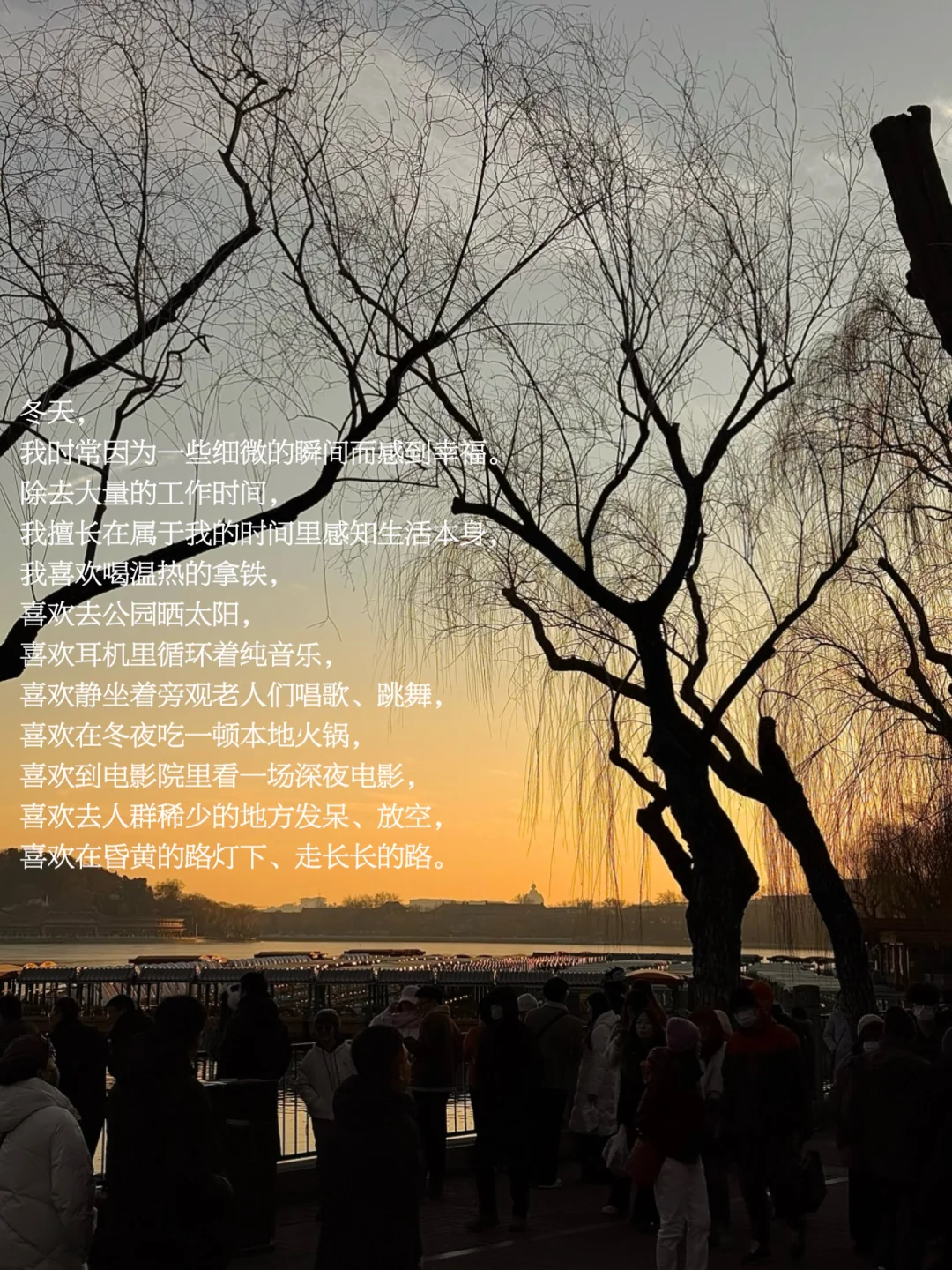 冬天,除去大量的工作时间,我擅长在属于我的时间里感知生活本身,我喜欢喝温热的拿铁,喜欢去公园晒太阳,喜欢耳机里循环着纯音乐,喜欢静坐着旁观老人们唱歌、跳舞,喜欢在冬夜吃一顿本地火锅,喜欢到电影院里看一场深夜电影,喜欢去人群稀少的地方发呆、放空,喜欢在昏黄的路灯下、走长长的路。