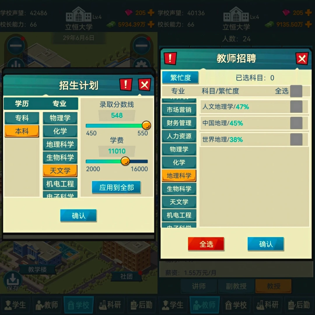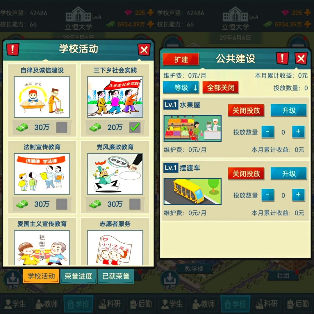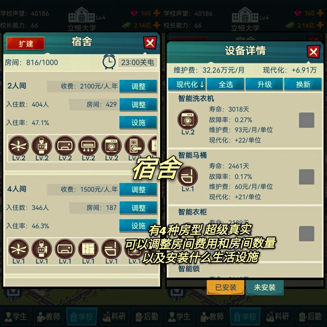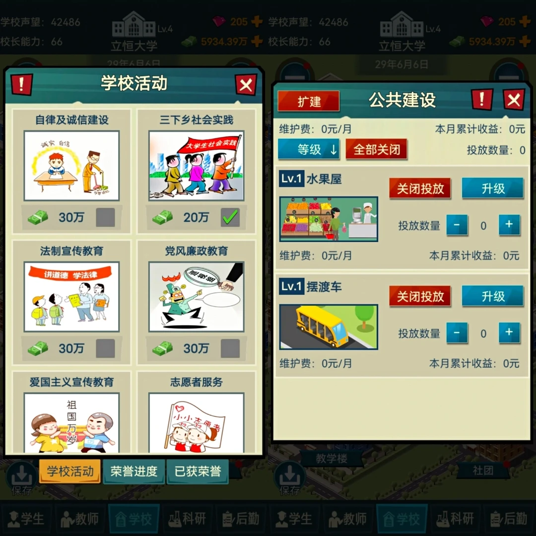 🔯还有超多细节的: 奖学金设置、教师招聘、后勤员工招聘、体育场地外租、和公司合作、投资、做慈善、开分校附属学校、建设高校活动(三下乡实践活动等等)、解决一些日常事件等等