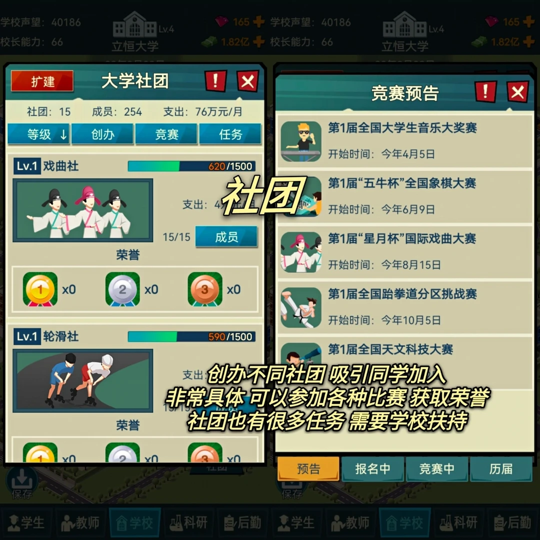 2⃣️社团: 正在读大学的应该很了解大学社团。有很多个社团供自由选择平时有各类比赛,以及帮社团成长的任务,这样才能更容易在比赛中获奖!