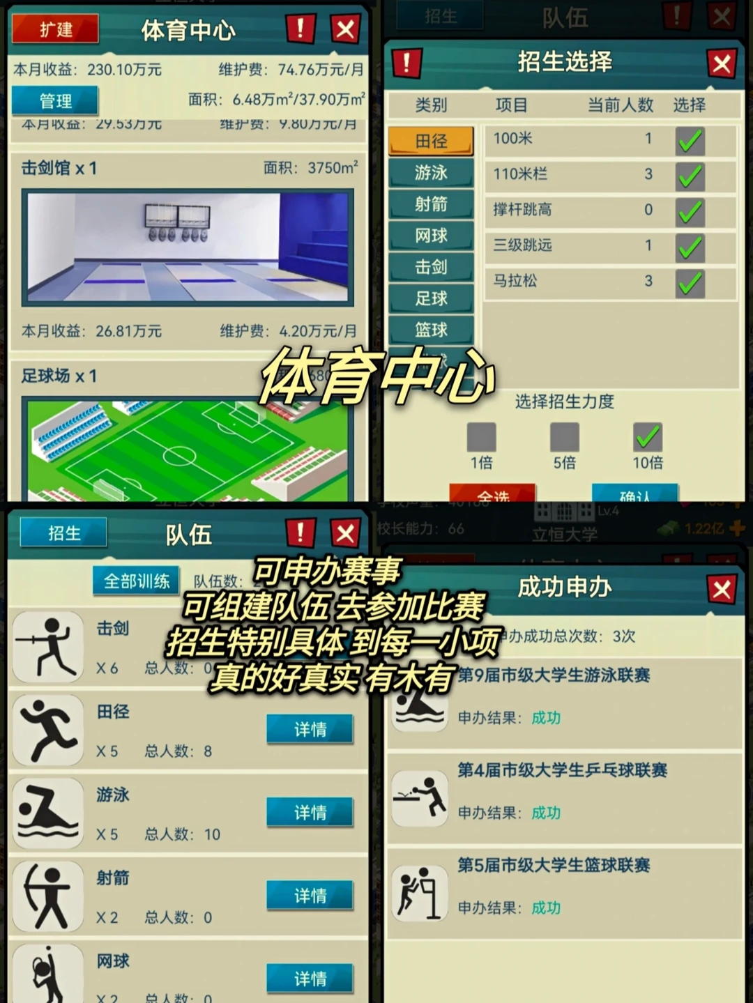 4⃣️体育中心:玩家可以组建各种战队(田径,游泳,射击,网球,击剑,足球,男球,排球,体操,乒乓球,羽毛球等),培养自己的体育战队,培养各种类型天赋的体育人才,当战队能力足够强大时可以进行各种比赛(大学生联赛,奥运会等)来斩获各种奖项(金牌银牌铜牌等)提高学校声望和知名度;(超真实有木有!)