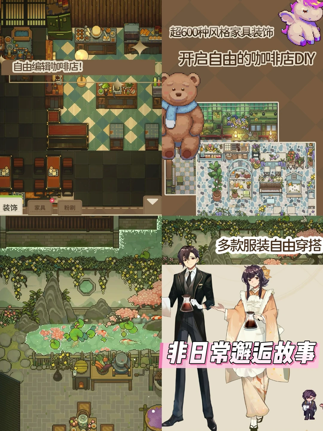 像素风的咖啡厅模拟经营 小人儿特别可爱☺️咖啡厅也可以自由布置不同风格 好玩儿。这个画风和氛围真的很赞 像是在异世界开了个咖啡厅