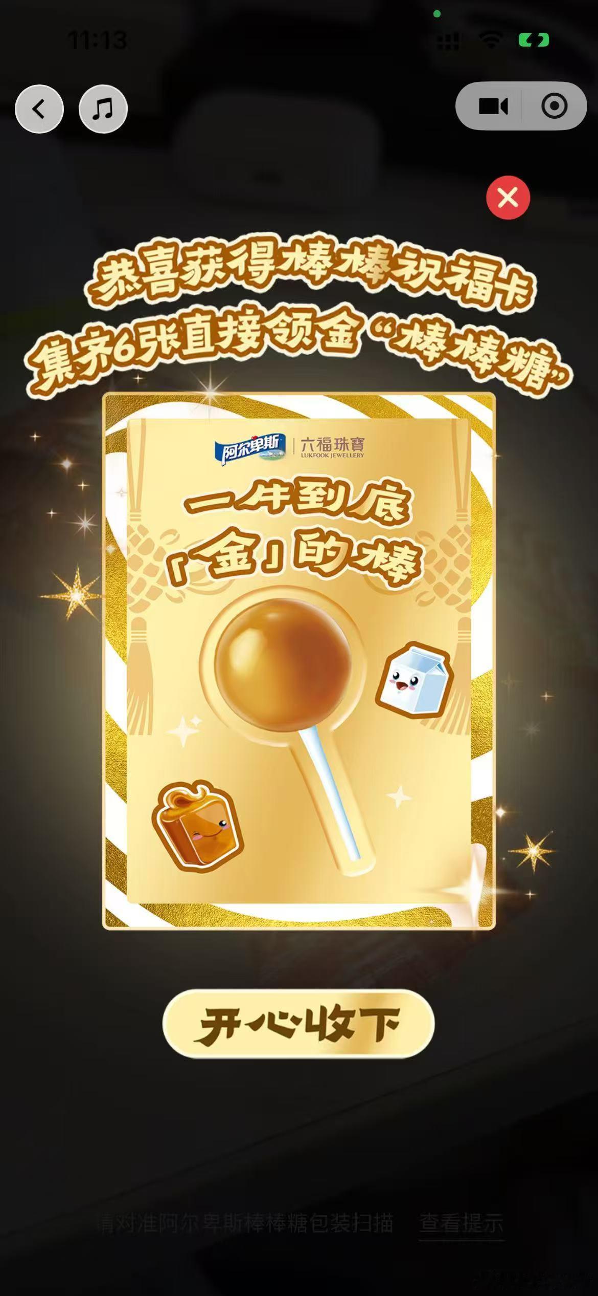 无痛攒金攻略祝你金的结么棒阿尔卑斯棒棒糖原来攒金可以这么无痛!之前还半信半疑,直到我扫出了那根金灿灿的棒棒糖。瞬间感觉被财运砸中。方法超简单,上微信搜小程序就能参与。这波福利不蹭真的亏大了,快去试试你的运气吧!