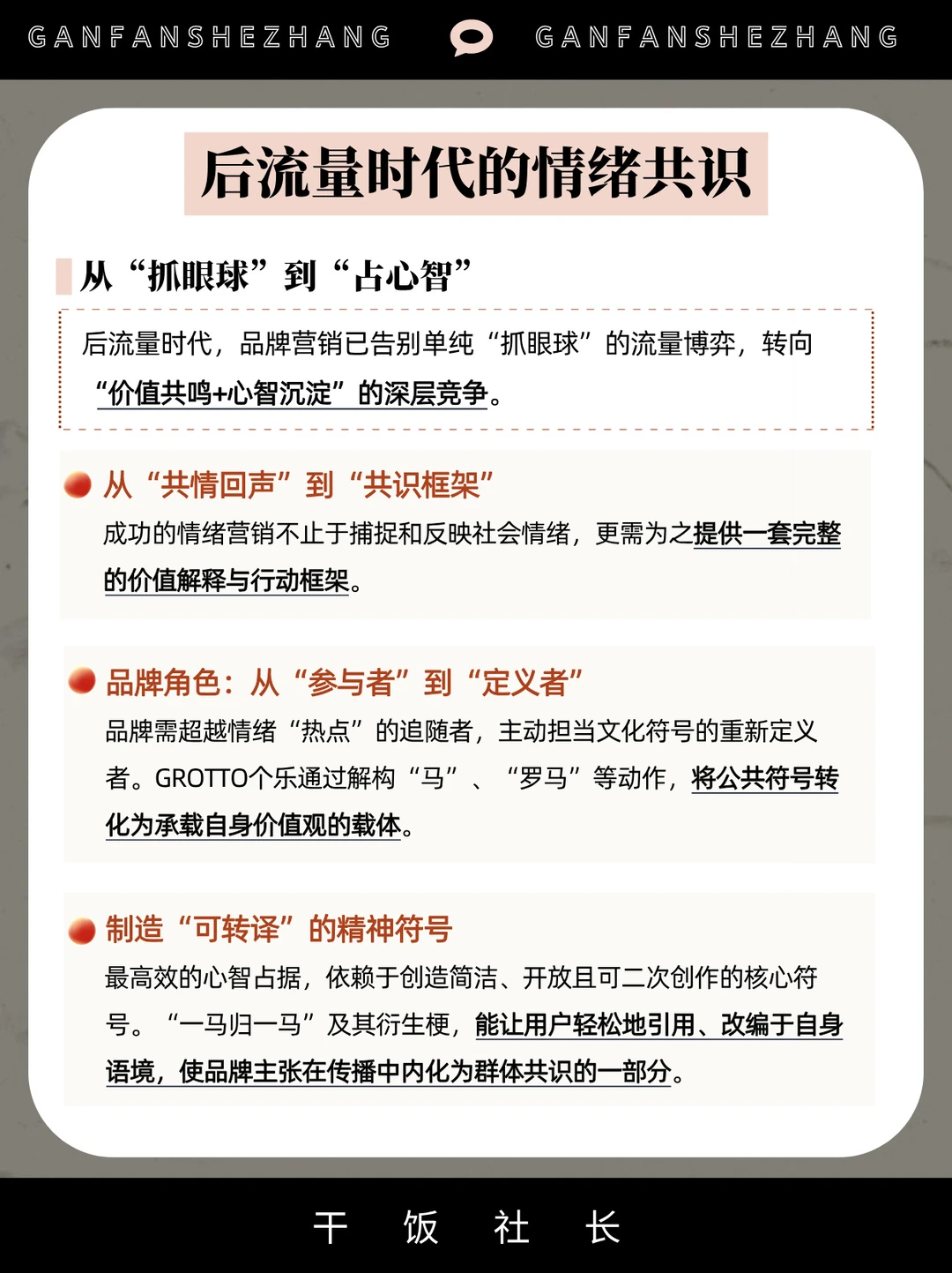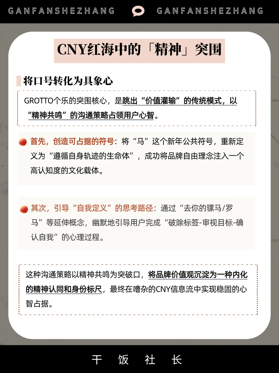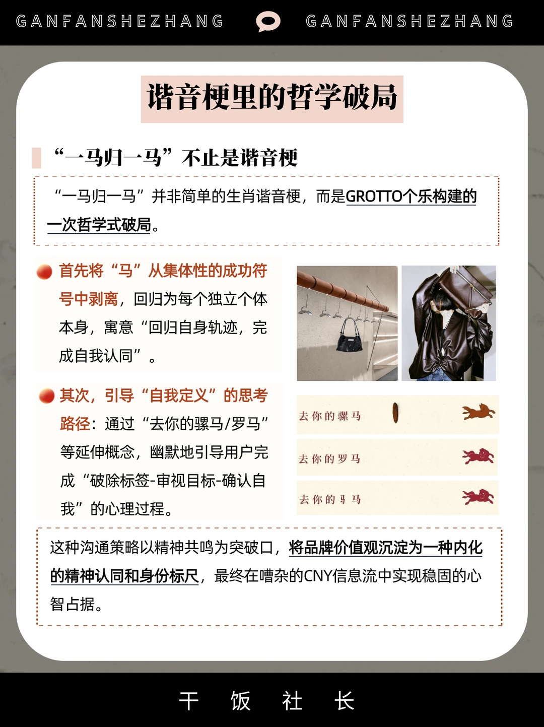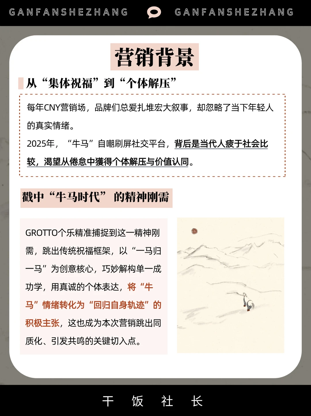 在众多以祝福为底色的CNY营销中,GROTTO个乐给出了一个截然不同的回应。用一马归一马”的核心创意,精准地回应了普通人“牛马”生活中的疲惫与自嘲。