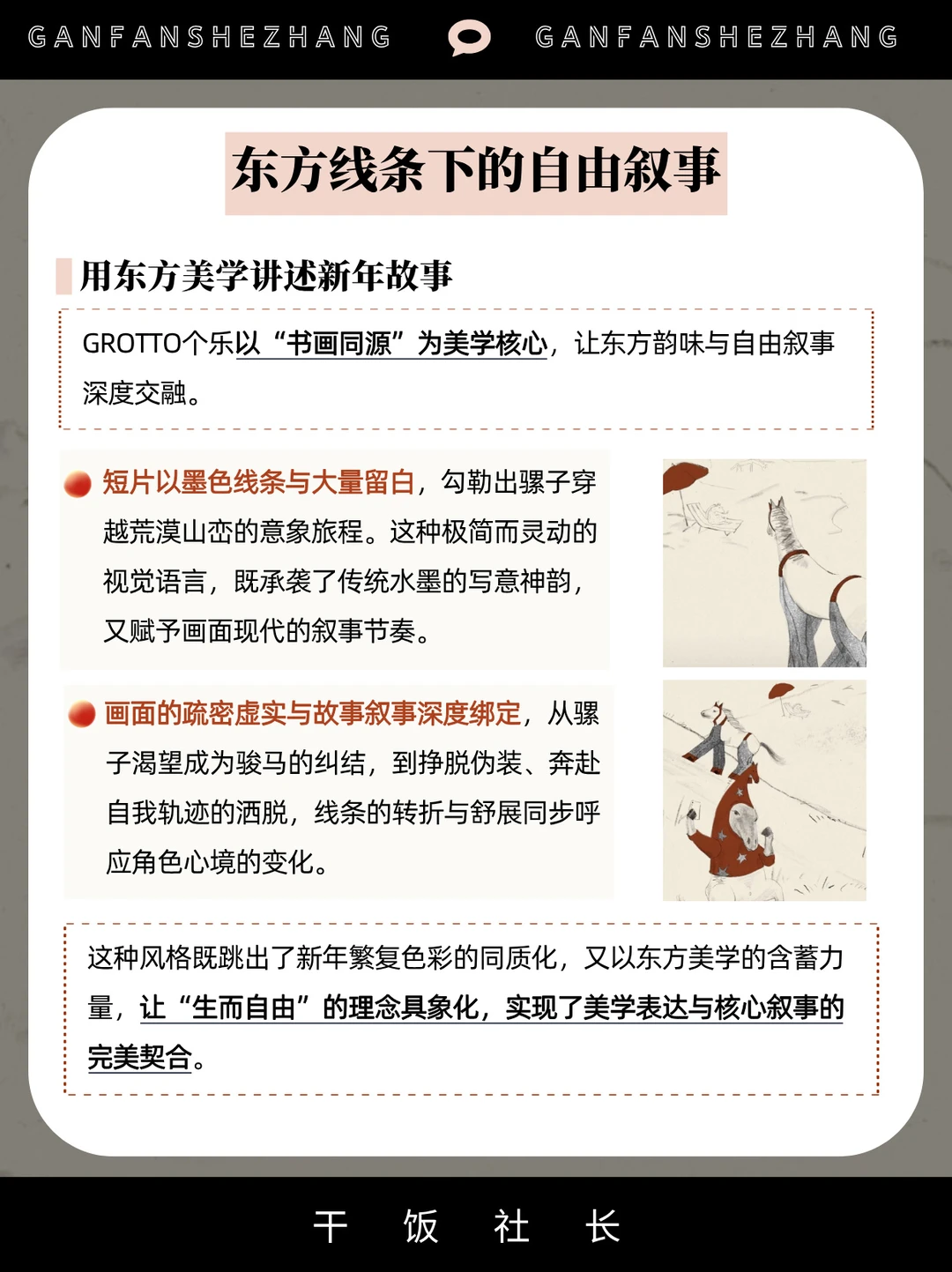 配合“书画同源”、充满留白与线条感的东方美学短片,GROTTO个乐将一场新年传播,升维为一次关于“自我认知”与“自由选择”的精神对话,让创意沉淀为更具情感力的品牌心智,也让我们看到CNY营销情绪解法的高分范本。