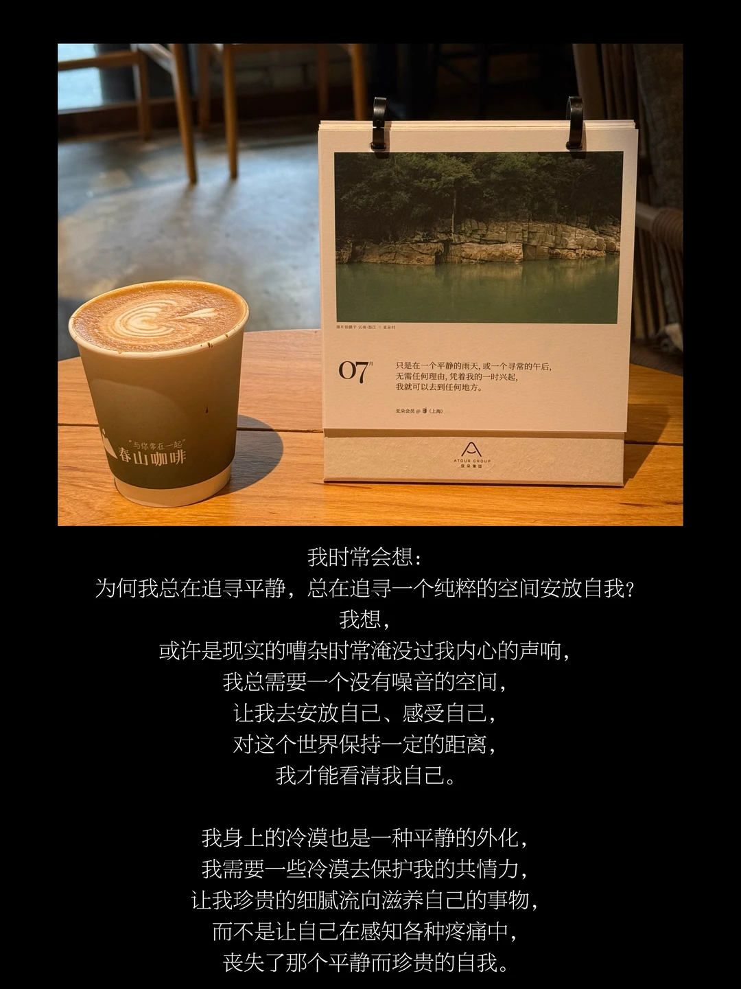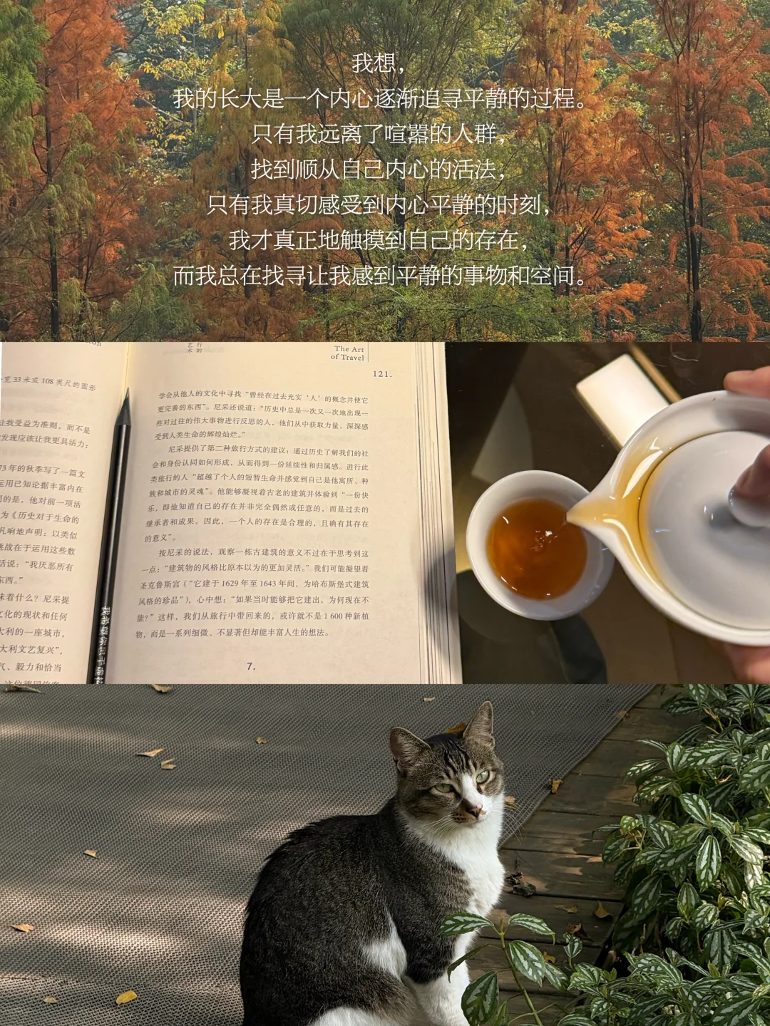 在陌生的环境,在只有自己存在的空间,在允许自己以任何形式生长的日子,我才是完整而真实的自己。只有我真切感受到内心平静的时刻,我才真正触摸到自己的存在,而我总在找寻让我感到平静的事物。