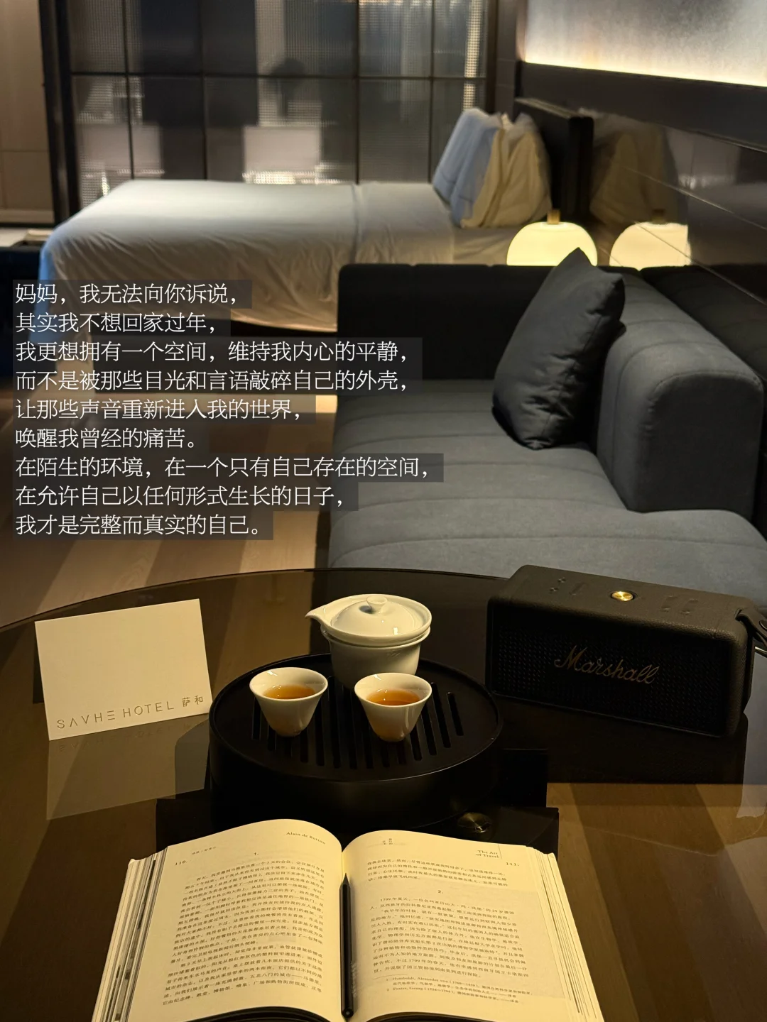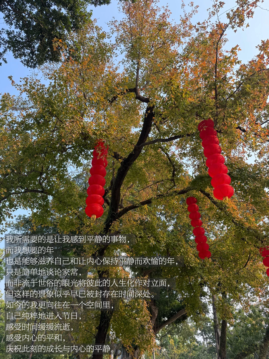 我所需要的是让我感到平静的事物,而我想要的年也只是能够滋养自己和让内心保持平静而欢愉的年,只是简单谈论家常,而非流于世俗的眼光将彼此的人生化作对立面,但时过境迁。如今的我更向往在一个空间,感受时间缓缓流逝,感受内心的平和,庆祝此刻的成长与内心的平静。