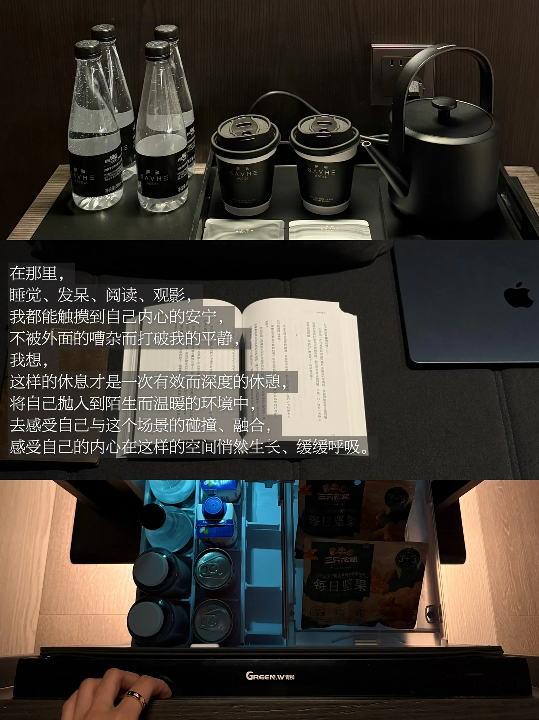房间里的暖光、偌大而舒适的床、僻静一角的茶桌、巨大的幕布、温馨的沙发,以及免费提供的小食,它们建构起这个温暖的空间,而洗手台一角也在妥帖安放我褶皱的心。一切都是井井有条中流露出温暖质感的存在,在那里,睡觉、发呆、阅读、观影,我都能触摸到自己内心的安宁,不被外面的嘈杂而打破我的平静。