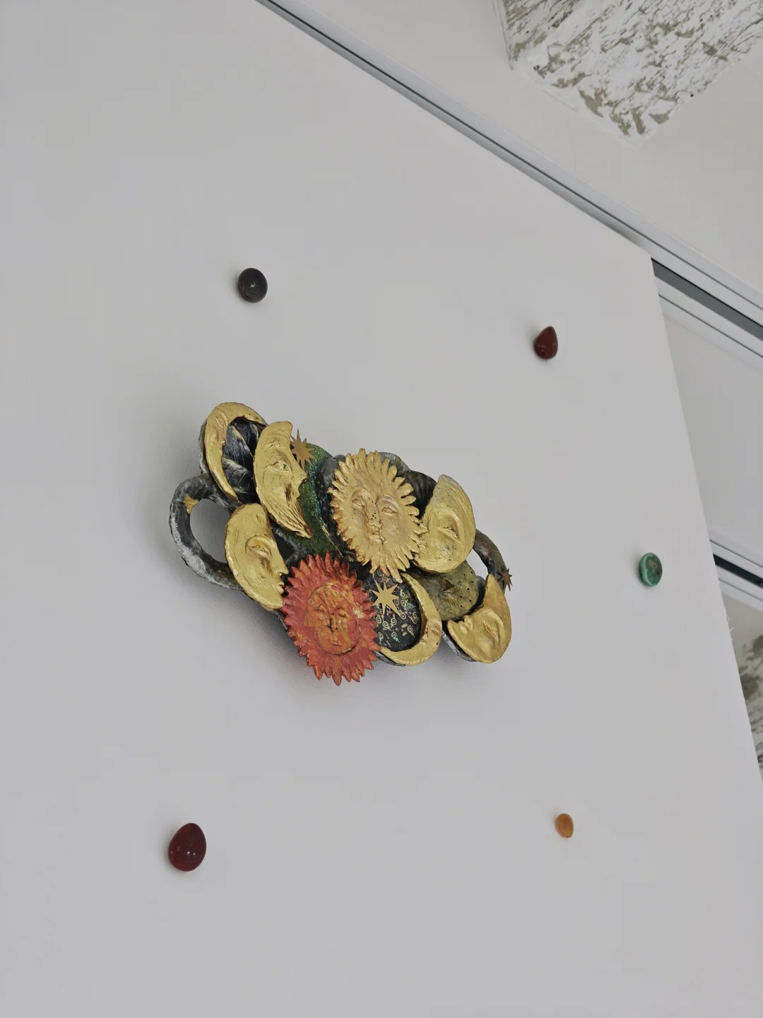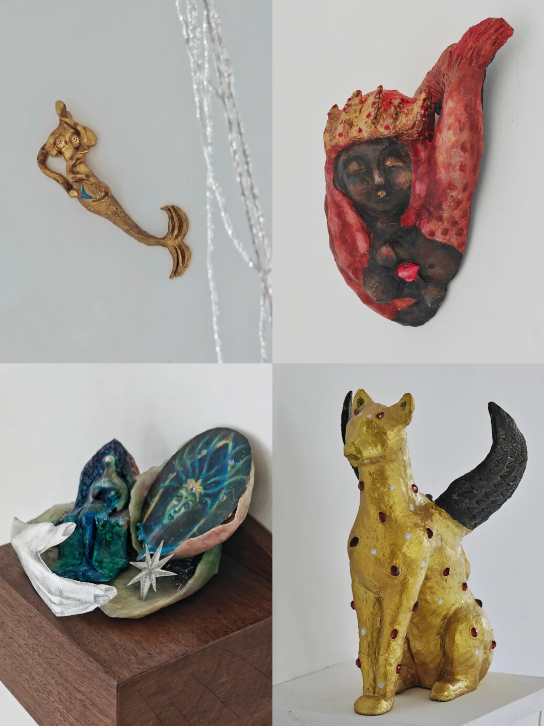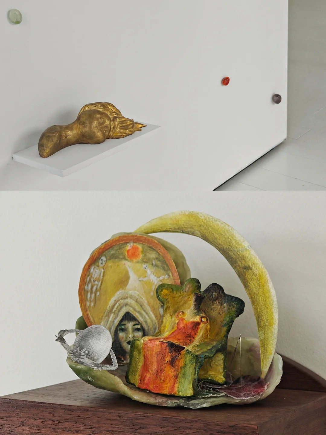🖼️艺术家的24件新作,包括综合材料绘画与雕塑,运用粘土、金箔、丙烯、布料等多元媒介。