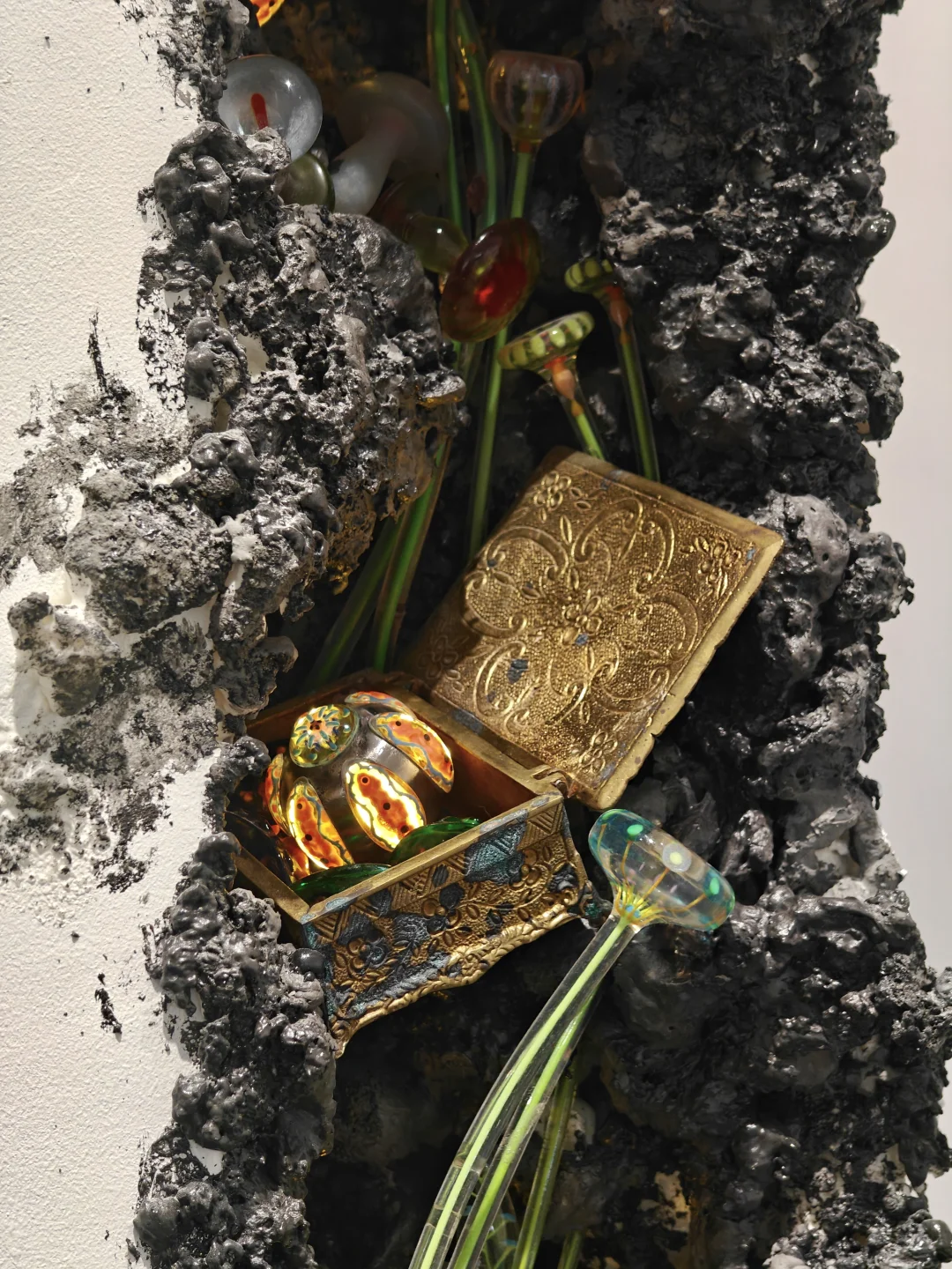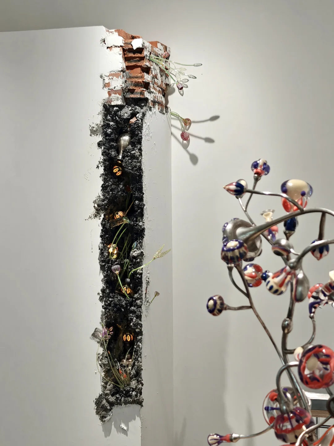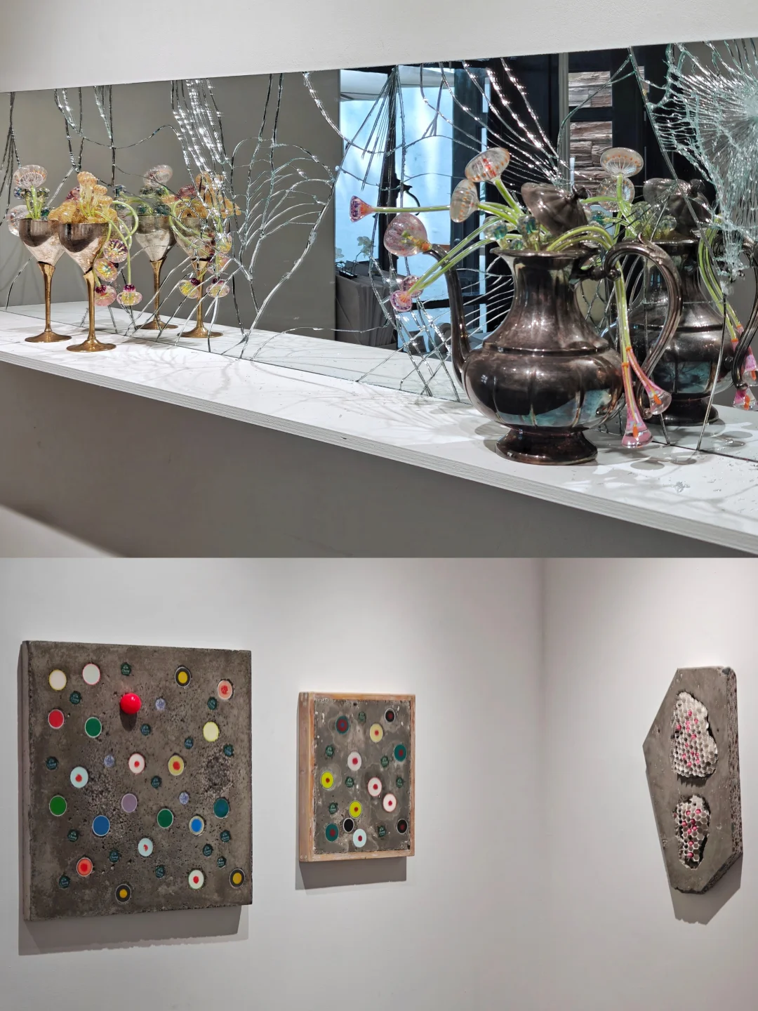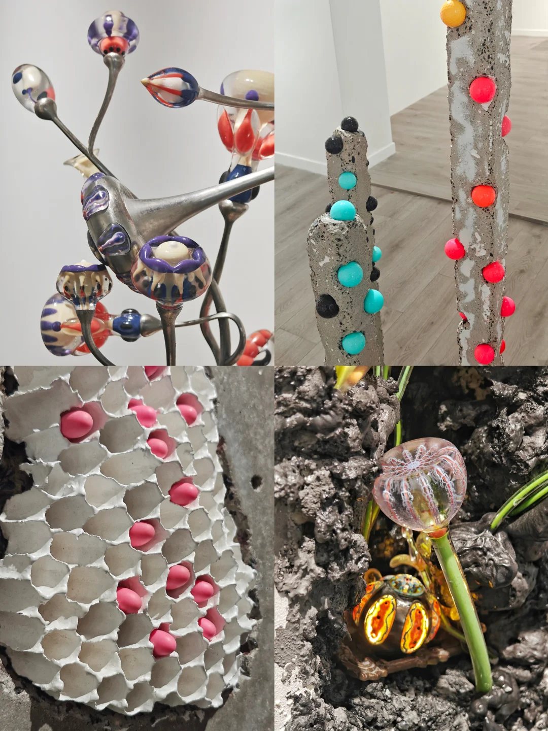 血管里有沙\n📆4月20日-6月1日\n🕙周二至周日11:00-17:00\n📍DOSE画廊 五原路[搜索高亮]212弄7号底楼花园\n👨🏻\u200d🎨吴逸飞|顾忠升\n\t\n🖼️通过\"有机生长\"与\"无机现实\"的辩证关系,探讨硅基文明时代的人类存在状态。标题\"血管里有沙\"象征人类机体已渗透非有机质,暗示无机生长在无意识中早已开始。\n\t\n👨🏻\u200d🎨吴逸飞\n3D打印技术+现成品=\"无机植物学\"臆想生物实体化\n👉花瓶是铜镀银的现成品,3D打印的部分乍一看还以为是吹制玻璃,真的很像从金属的瓶体中“长”出来的“花朵”。整体复古的氛围让我联想到蕞喜欢的1960年代科幻经典Star Trek中的硅基生物。\n\t\n👨🏻\u200d🎨顾忠升\n水泥材料+现成品=“旧状态”流动到“新状态”的中间形态凝固瞬间\n👉同样是无机物,水泥材质中嵌合入彩色的高尔夫球和瓶盖等现成品,像是外星沙漠中的有毒植物,又像放大了亿万倍的微生物模型,视觉冲击力拉满的同时有点密恐不友好。\n\t\n💗关注我,每天带你免费看展💗\n