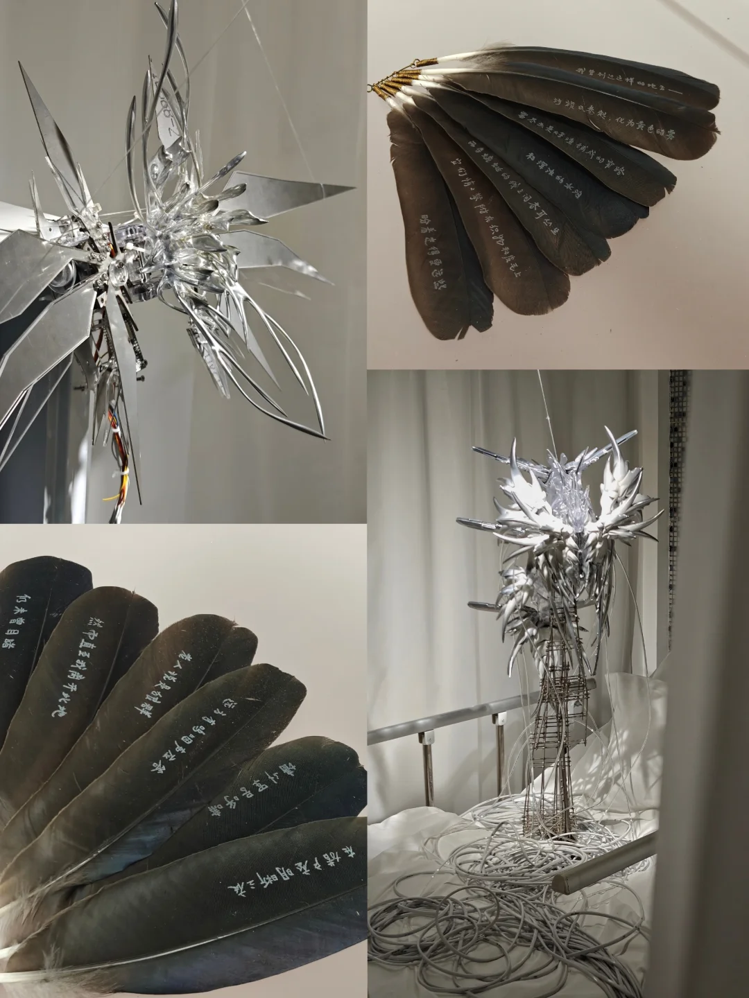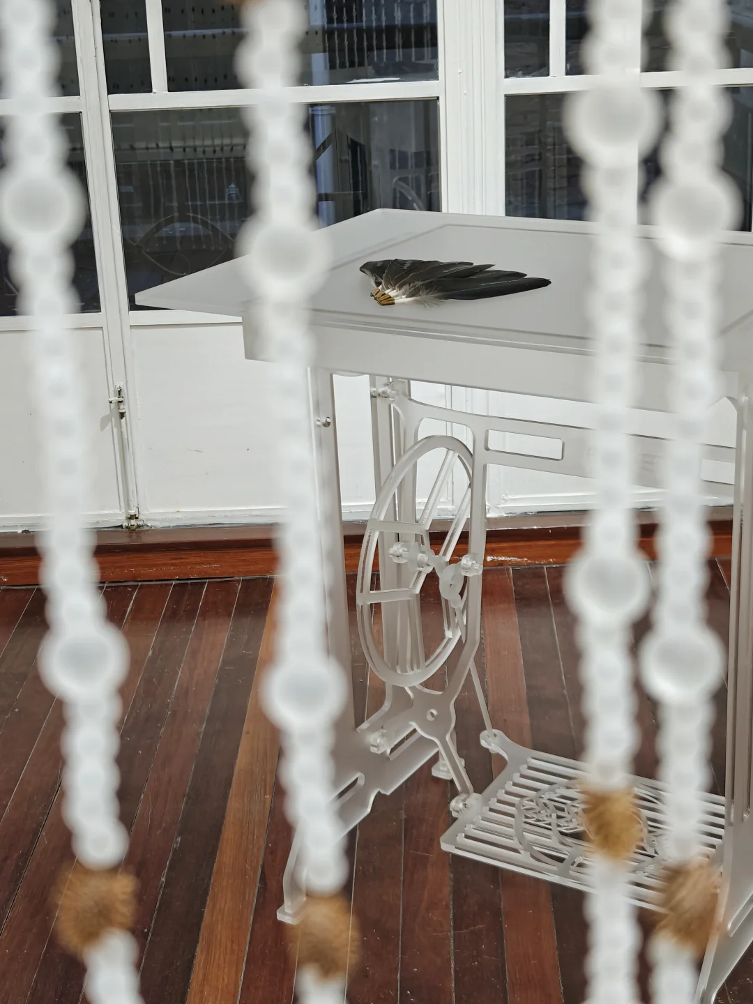 ⚫未曾目睹:透明缝纫机装置与印有诗句的羽毛书共同构建了一种超现实氛围,是艺术家对家庭、劳动和童年的模糊记忆