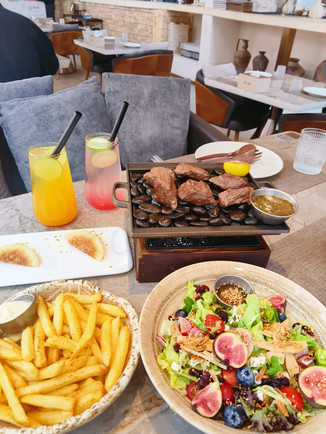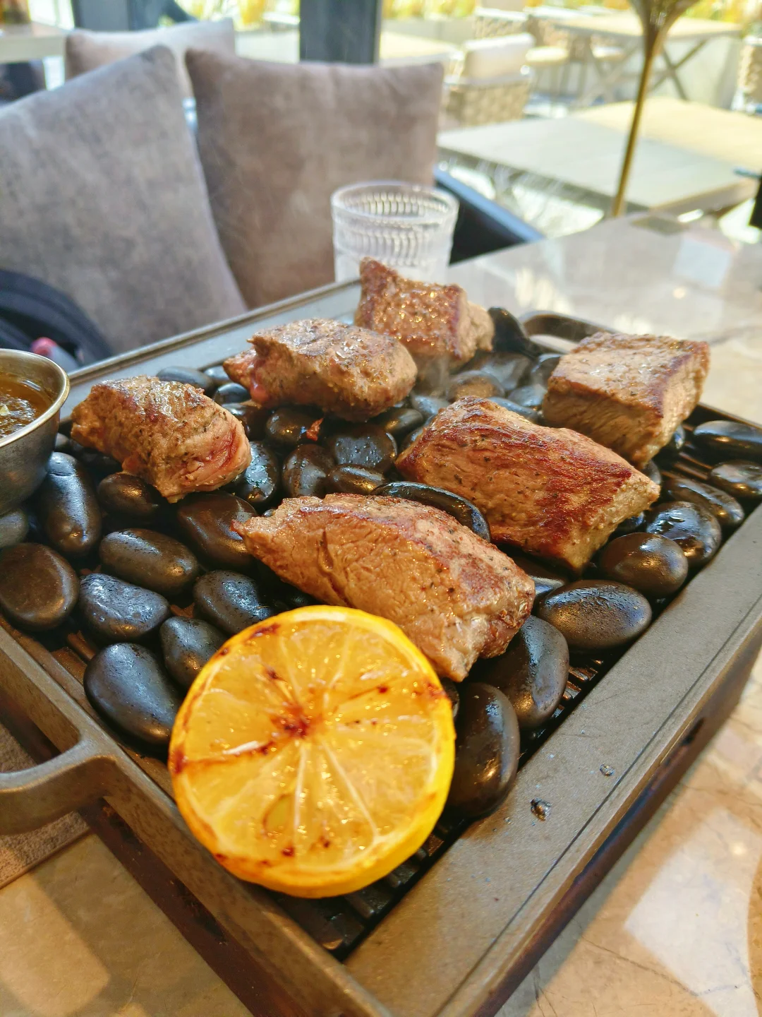 厚切的牛柳在烤热的黑火山石块上慢慢烤熟,慢工出细活,烤出来的牛柳鲜嫩多汁,齿后留香