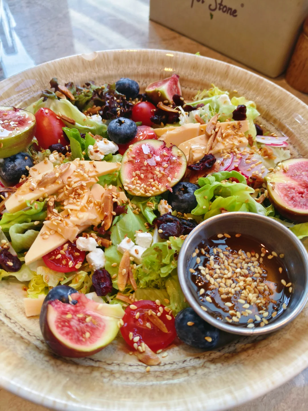 理想的健康食材,香甜的无花果配着各种鲜蔬和坚果,浇上芝士酱,好吃又健康
