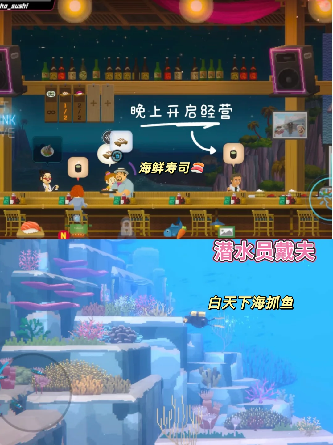白天下海捕鱼晚上直接鲜货做寿司🍣 既能体验海底冒险 又能体验经营寿司店的快乐🎊