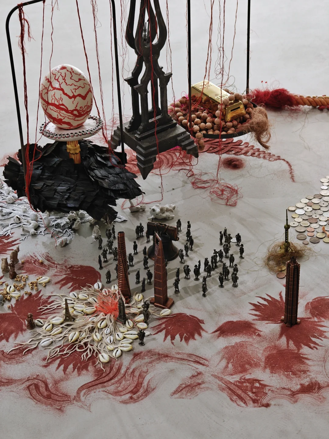 作品灵感来源于孟加拉国饮用水危机与工业化生态破坏。倒置穹顶象征生态秩序颠覆,灯泡与沙质水域图影射人类对环境的重塑,⚖️上的金条、各国🪙、贝壳,直白地指涉为了追求利益而过度的工业化开发。